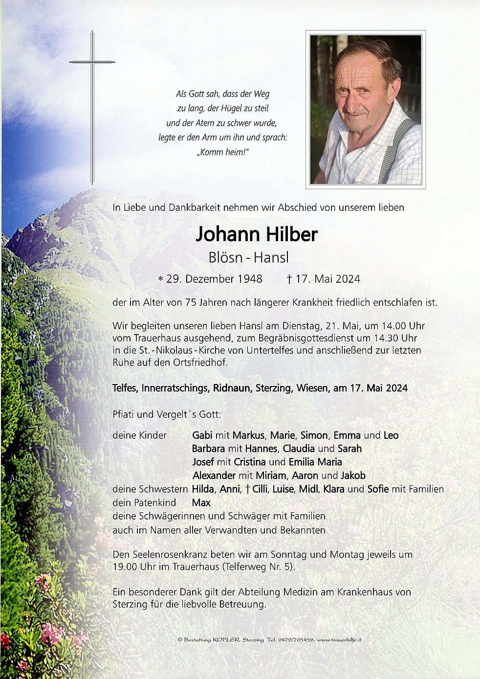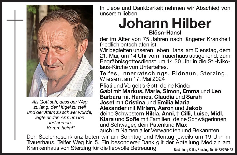 Wir begleiten unseren lieben Hansl am Dienstag, 21. Mai, um 14.00 Uhr vom Trauerhaus ausgehend, zum Begräbnisgottesdienst um 14.30 Uhr in die St.- Nikolaus- Kirche von Untertelfes und anschließend zur letzten Ruhe auf den Ortsfriedhof.