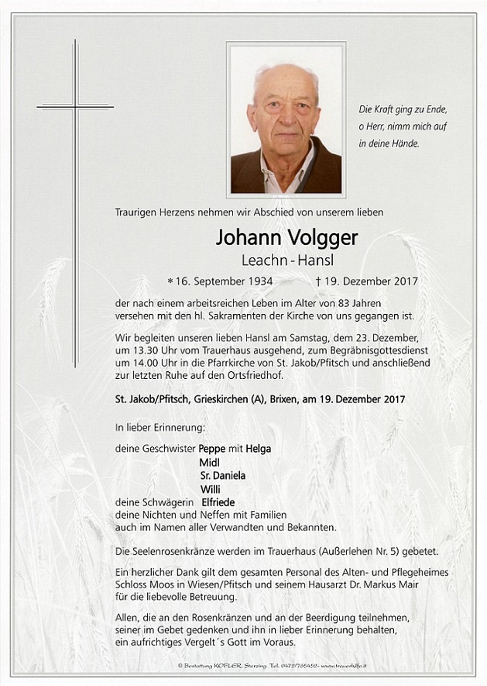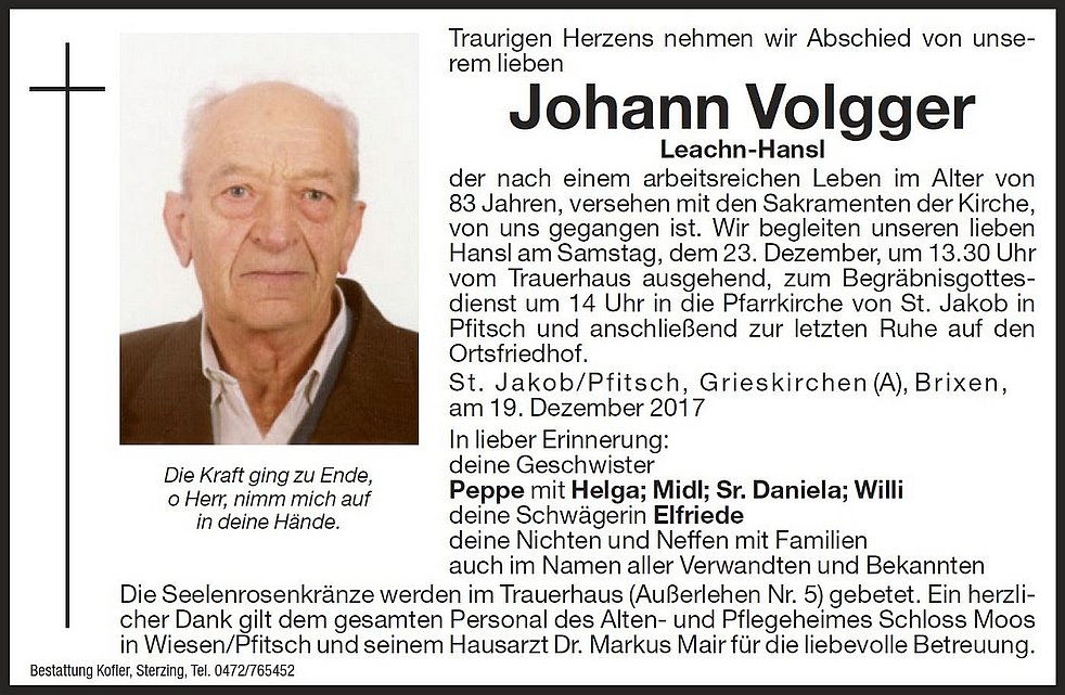 Wir begleiten unseren lieben Hansl am Samstag, dem 23. Dezember, um 13.30 Uhr vom Trauerhaus ausgehend, zum Begräbnisgottesdienst um 14.00 Uhr in die Pfarrkirche von St. Jakob/Pfitsch und anschließend zur letzten Ruhe auf den Ortsfriedhof.