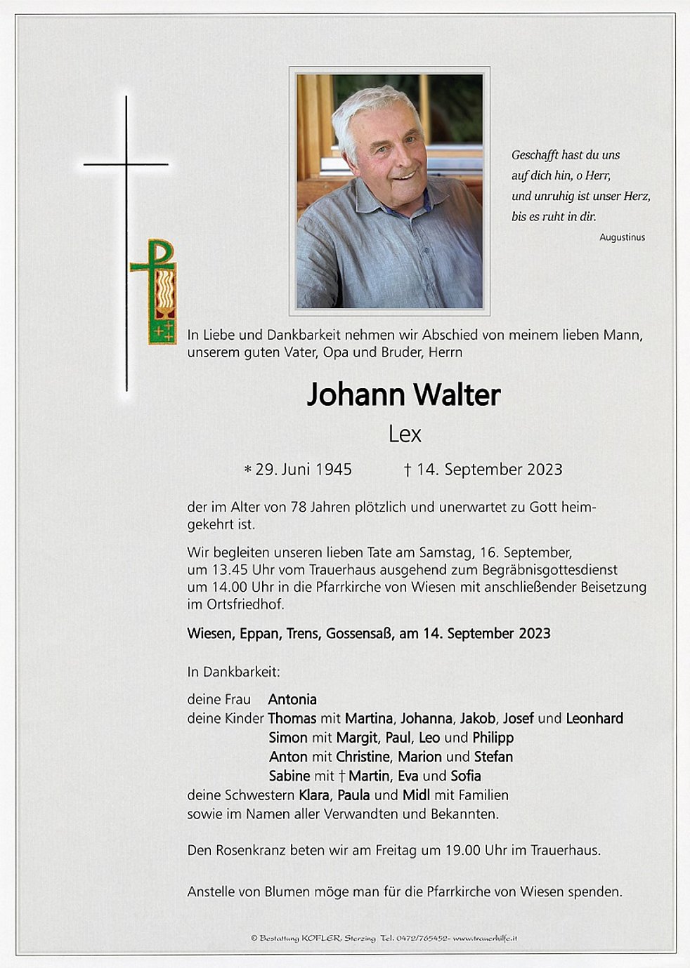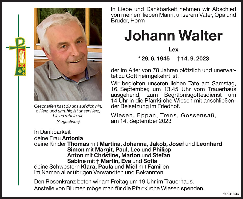 Wir begleiten unseren lieben Tate am Samstag, 16. September, um 13.45 Uhr vom Trauerhaus ausgehend zum Begräbnisgottesdienst um 14.00 Uhr in die Pfarrkirche von Wiesen mit anschließender Beisetzung im Ortsfriedhof.