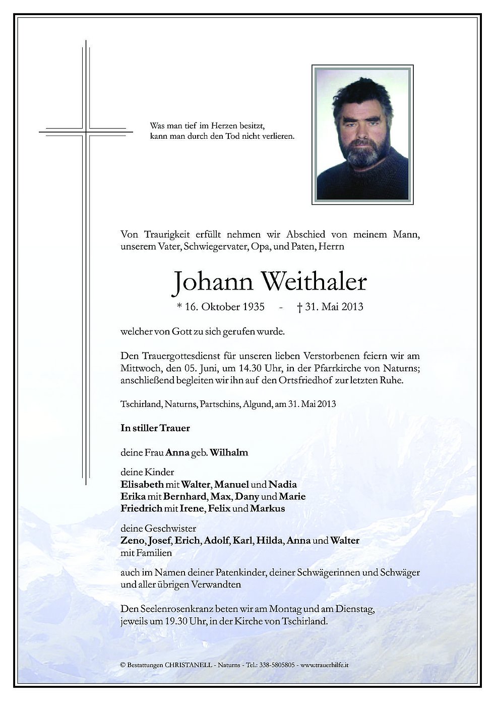 Den Trauergottesdienst für unseren lieben Verstorbenen feiern wir am Mittwoch, den 05. Juni, um 14.30 Uhr, in der Pfarrkirche von Naturns; anschließend begleiten wir ihn auf den Ortsfriedhof zur letzten Ruhe.