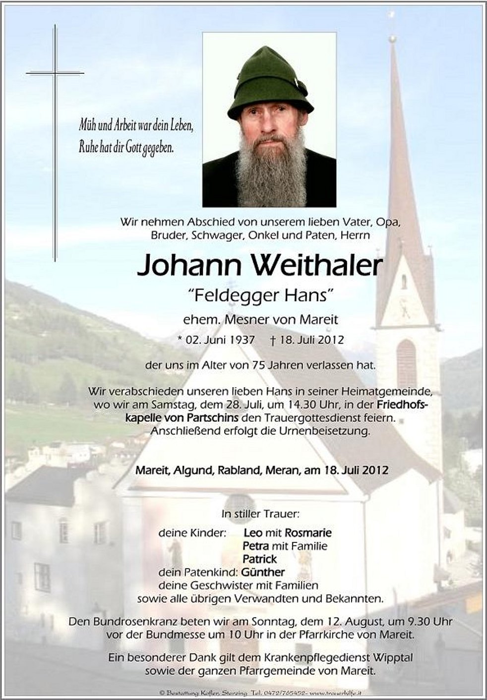 wo wir am Samstag, dem 28. Juli, um 14.30 Uhr, in der Friedhofskapelle von Partschins