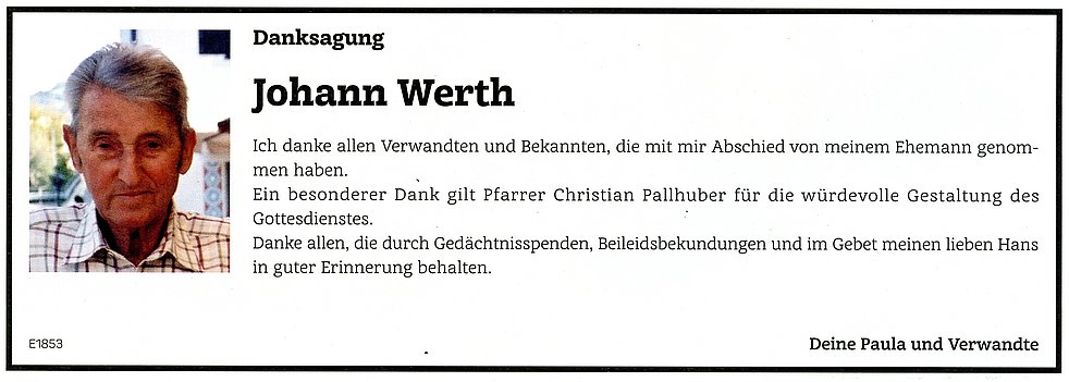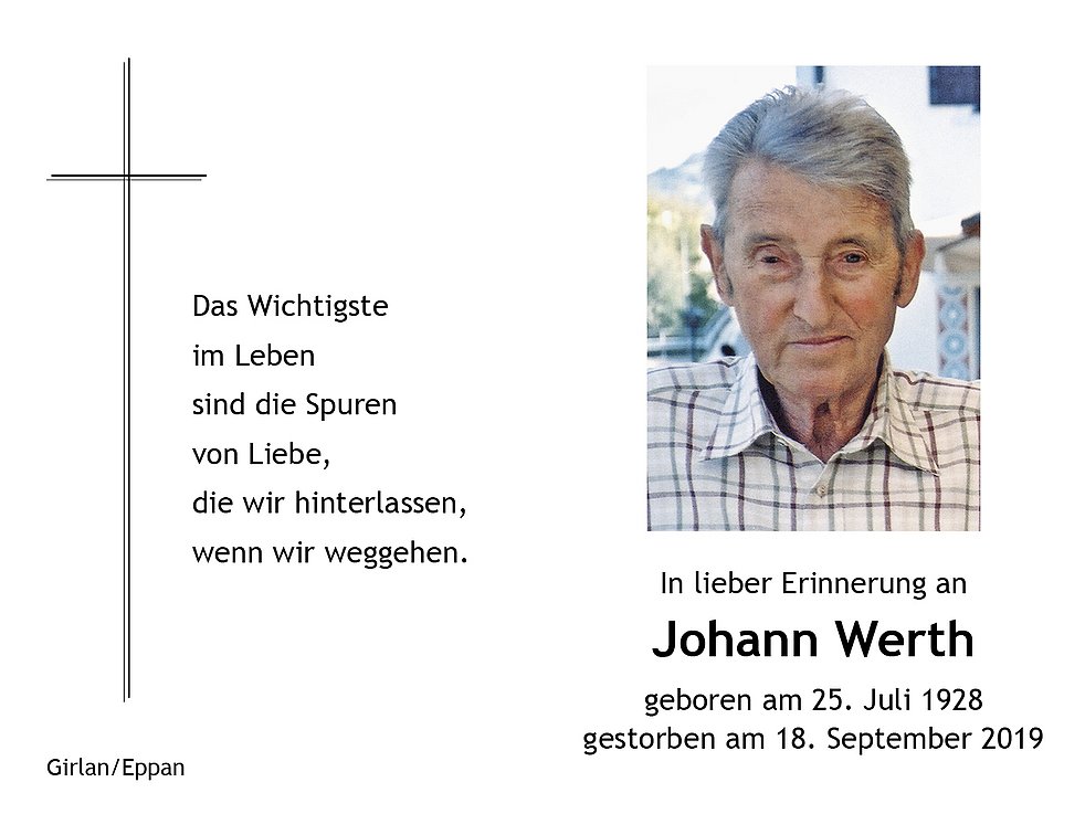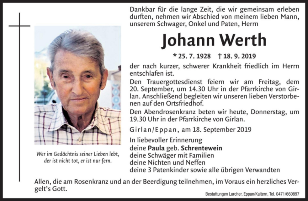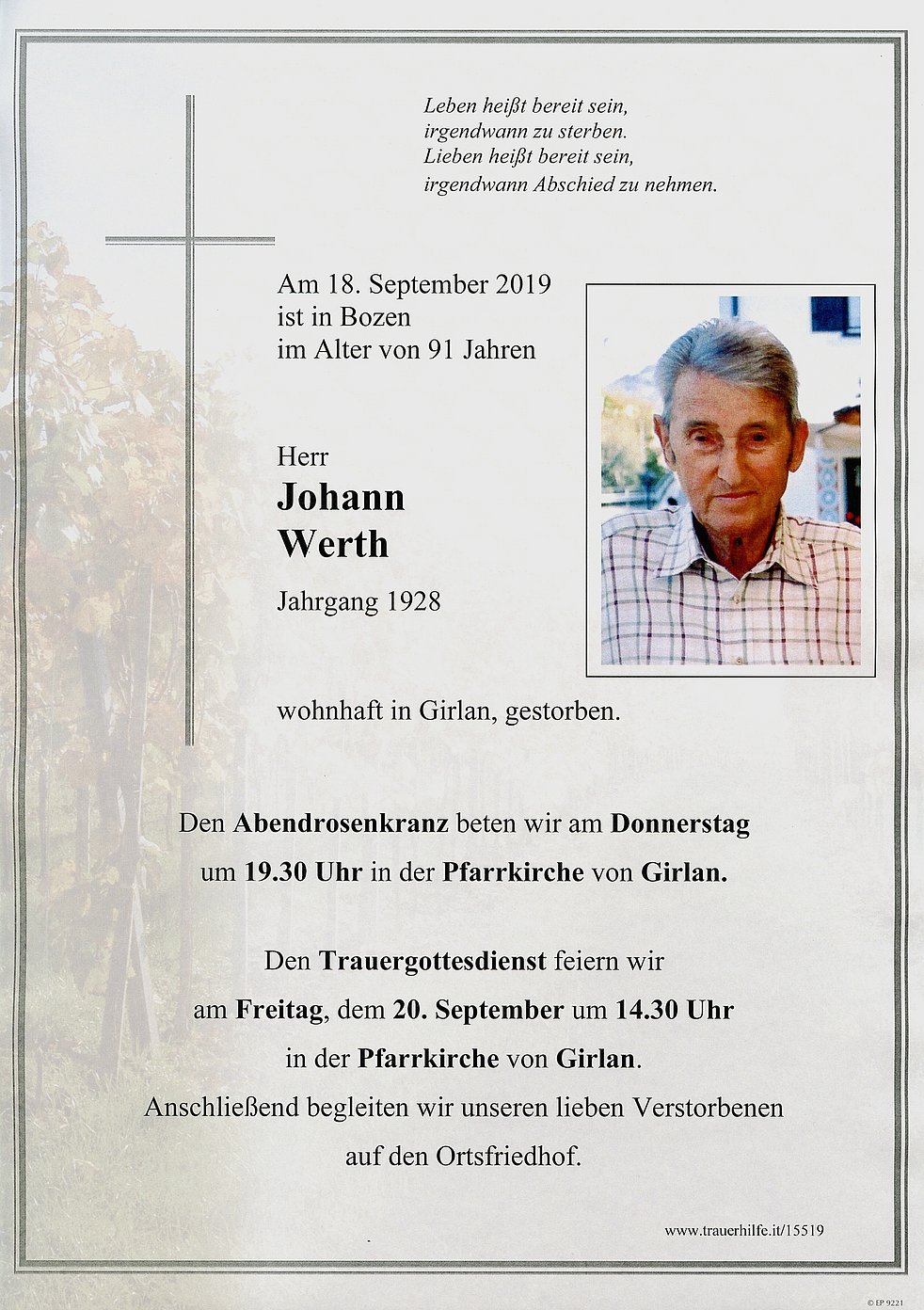 Den Trauergottesdienst feiern wir am Freitag, dem 20. September um 14.30 Uhr in der Pfarrkirche von Girlan. Anschließend begleiten wir unseren lieben Verstorbenen auf den Ortsfriedhof. Den Abendrosenkranz beten wir am Donnerstag, um 19. 30 Uhr in der Pfarrkirche von Girlan.