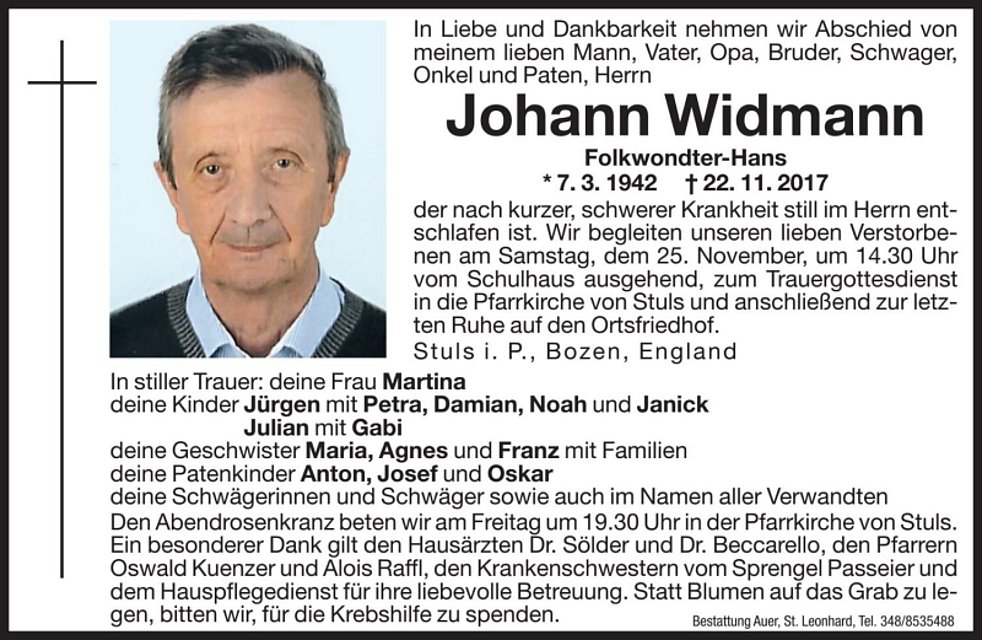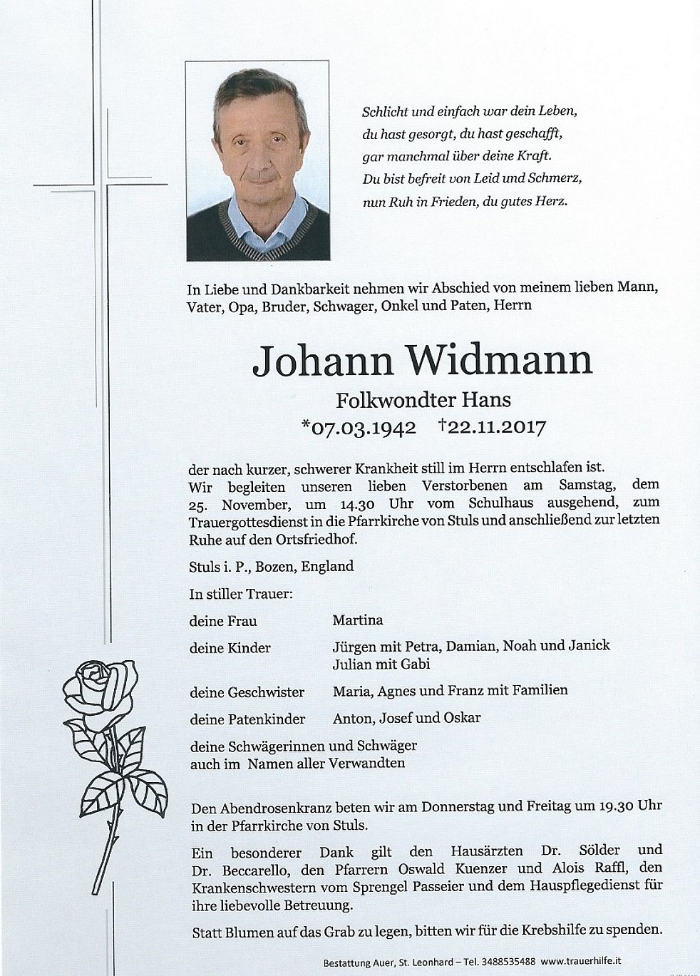 Wir begleiten unseren lieben Verstorbenen am Samstag, dem 25. November, um 14.30 Uhr vom Schulhaus ausgehend, zum Trauergottesdienst in die Pfarrkirche von Stuls und anschließend zur letzten Ruhe auf den Ortsfriedhof.