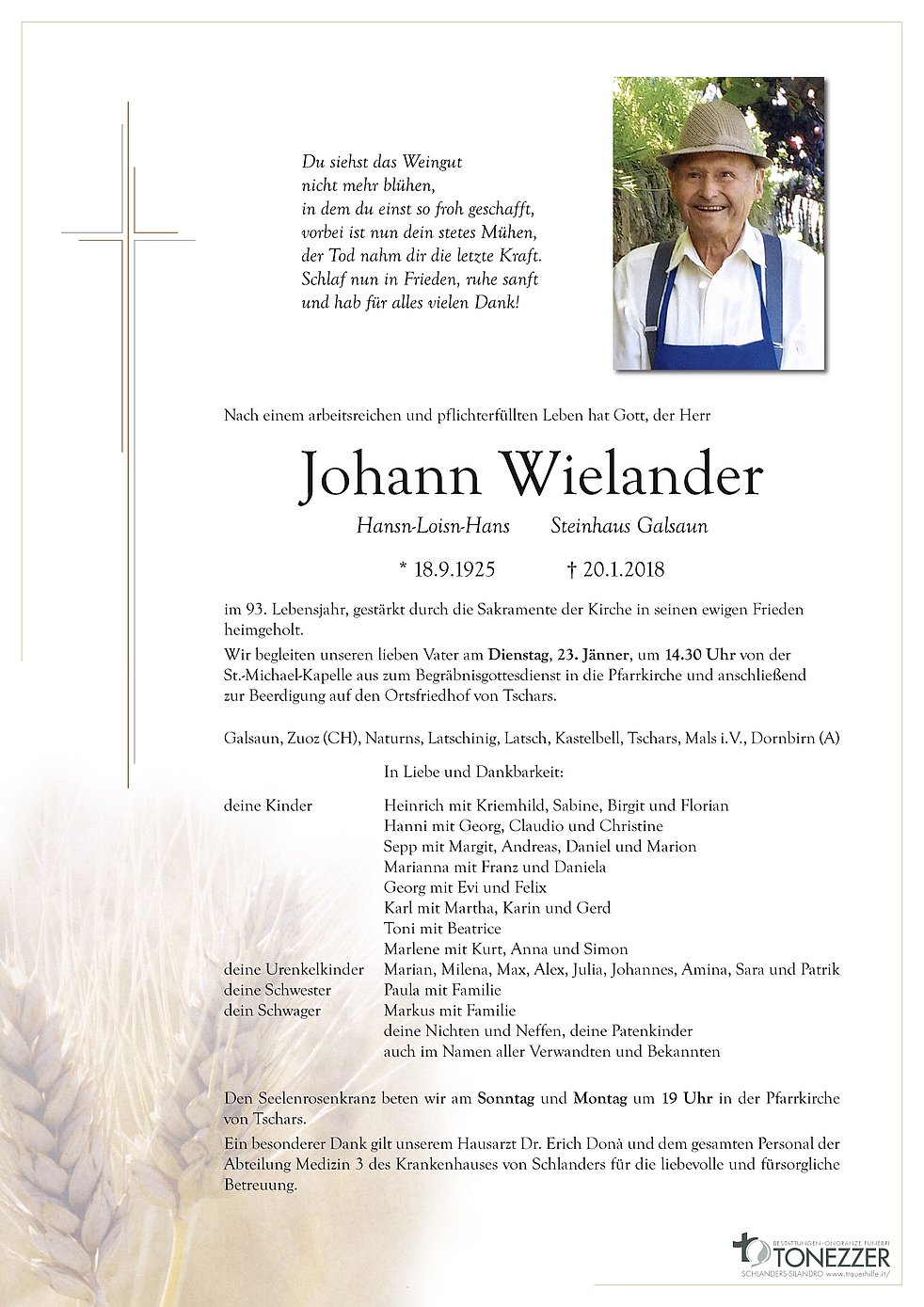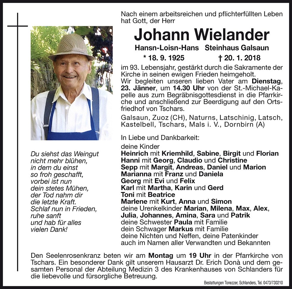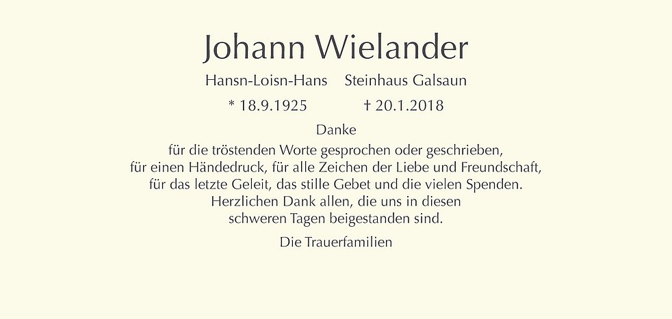 Wir begleiten unseren lieben Vater am Dienstag, 23. Jänner, um 14.30 Uhr von der St.-Michael-Kapelle aus zum Begräbnisgottesdienst in die Pfarrkirche und anschließend zur Beerdigung auf den Ortsfriedhof von Tschars.