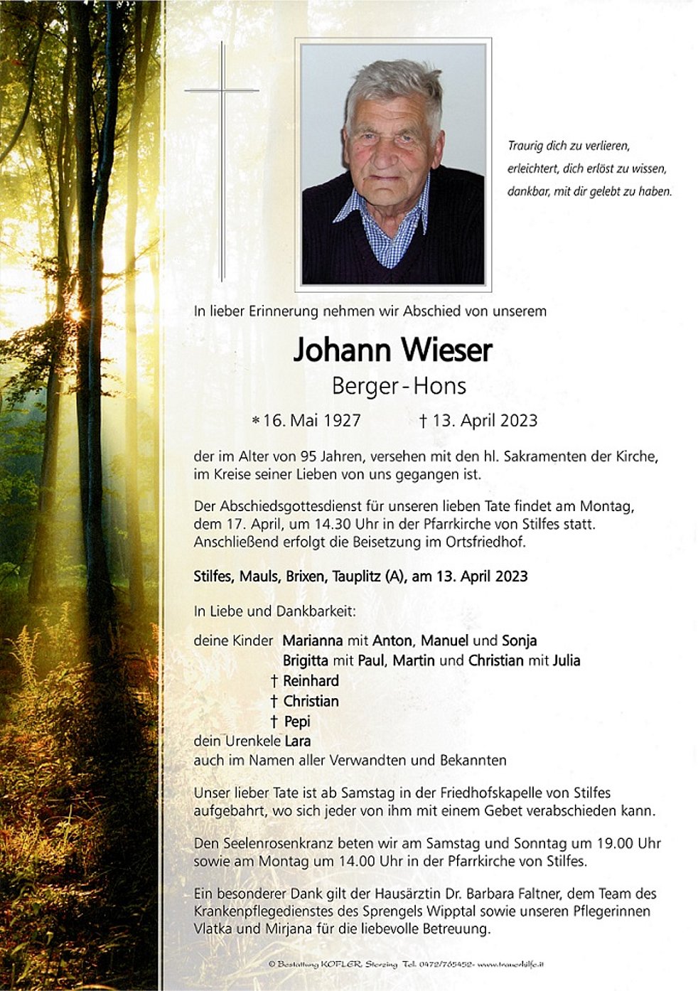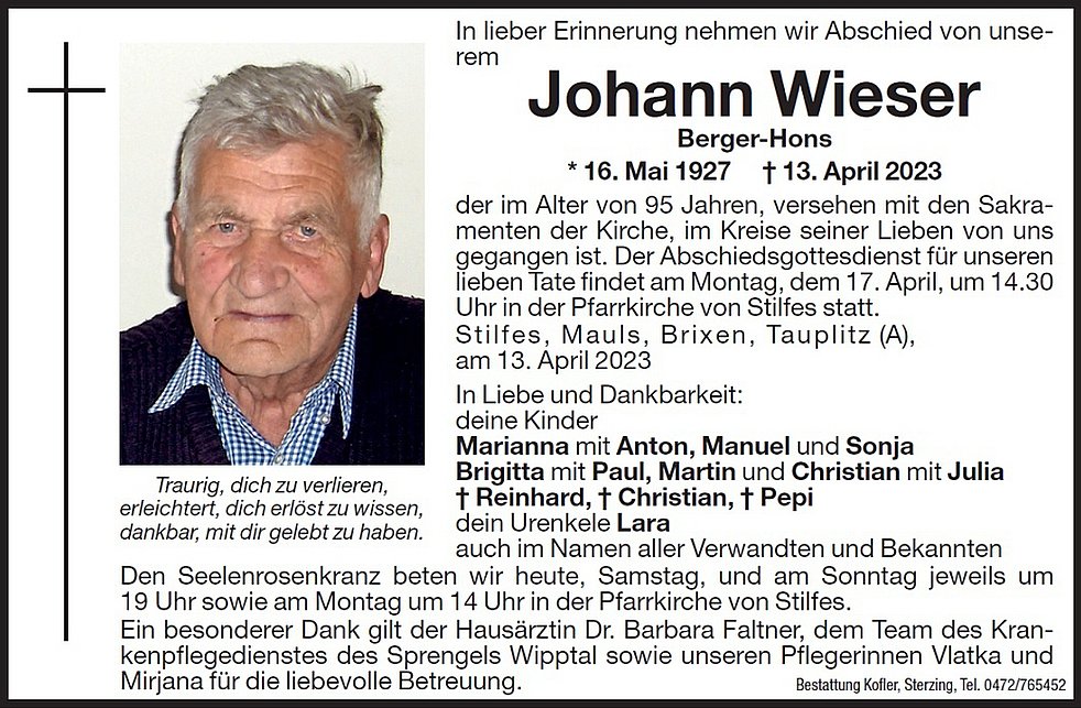 Der Abschiedsgottesdienst für unseren lieben Tate findet am Montag, dem 17. April, um 14.30 Uhr in der Pfarrkirche von Stilfes statt. Anschließend erfolgt die Beisetzung im Ortsfriedhof.