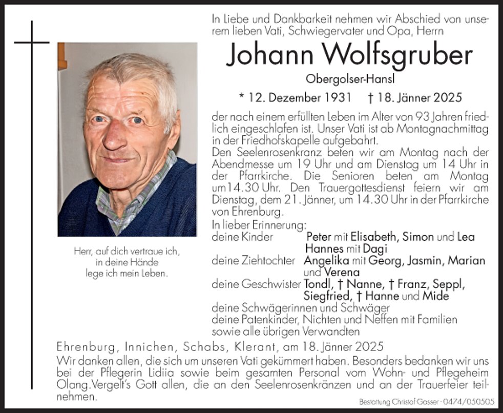 Den Trauergottesdienst feiern wir am Dienstag, dem 21. Jänner, um 14.30 Uhr in der Pfarrkirche von Ehrenburg.