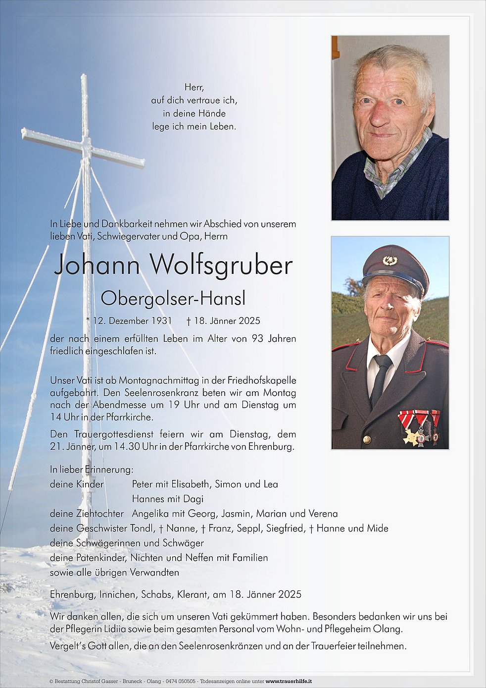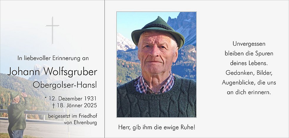 Wir danken allen, die sich um unseren Vati gekümmert haben. Besonders bedanken wir uns bei der Pflegerin Lidiia sowie beim gesamten Personal vom Wohn- und Pflegeheim Olang.