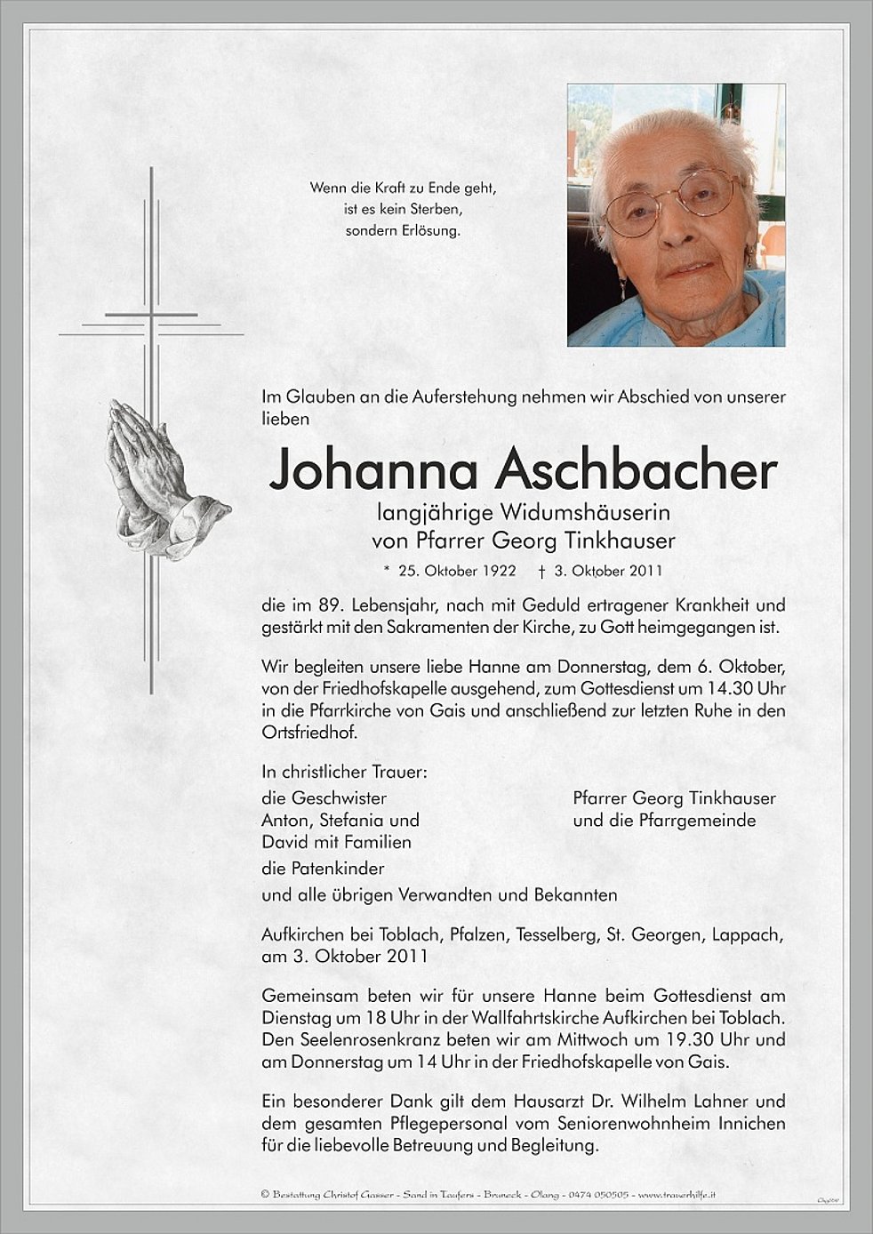 Wir begleiten unsere liebe Hanne am Donnerstag, dem 6. Oktober, von der Friedhofskapelle ausgehend, zum Gottesdienst um 14.30 Uhr in die Pfarrkirche von Gais und anschließend zur letzten Ruhe in den Ortsfriedhof.