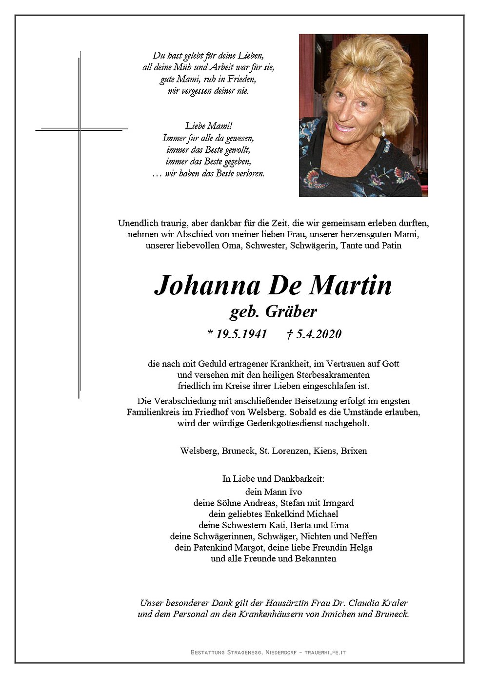 Die Verabschiedung mit anschließender Beisetzung erfolgt im engsten Familienkreis im Friedhof von Welsberg. Sobald es die Umstände erlauben, wird der würdige Gedenkgottesdienst nachgeholt.