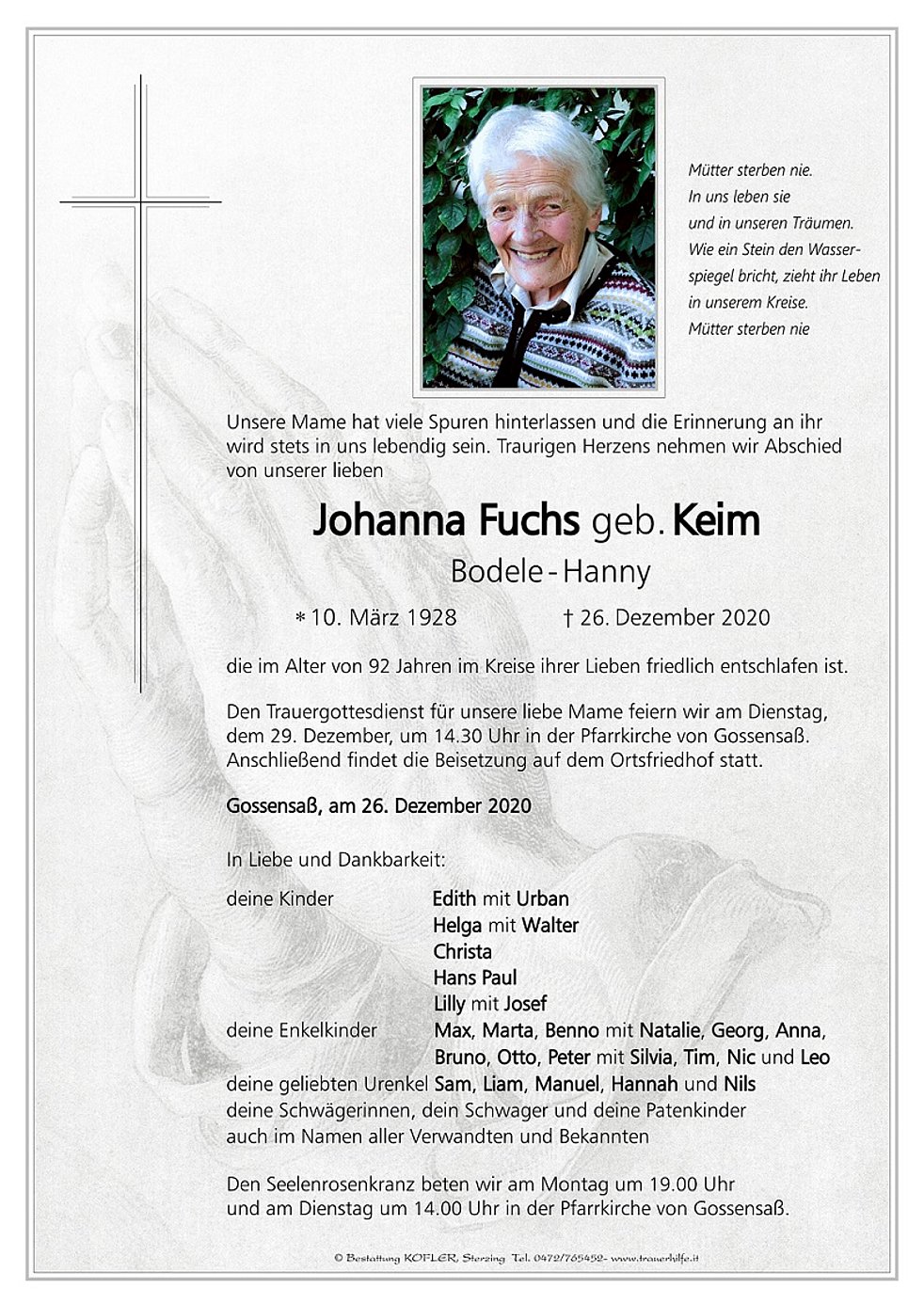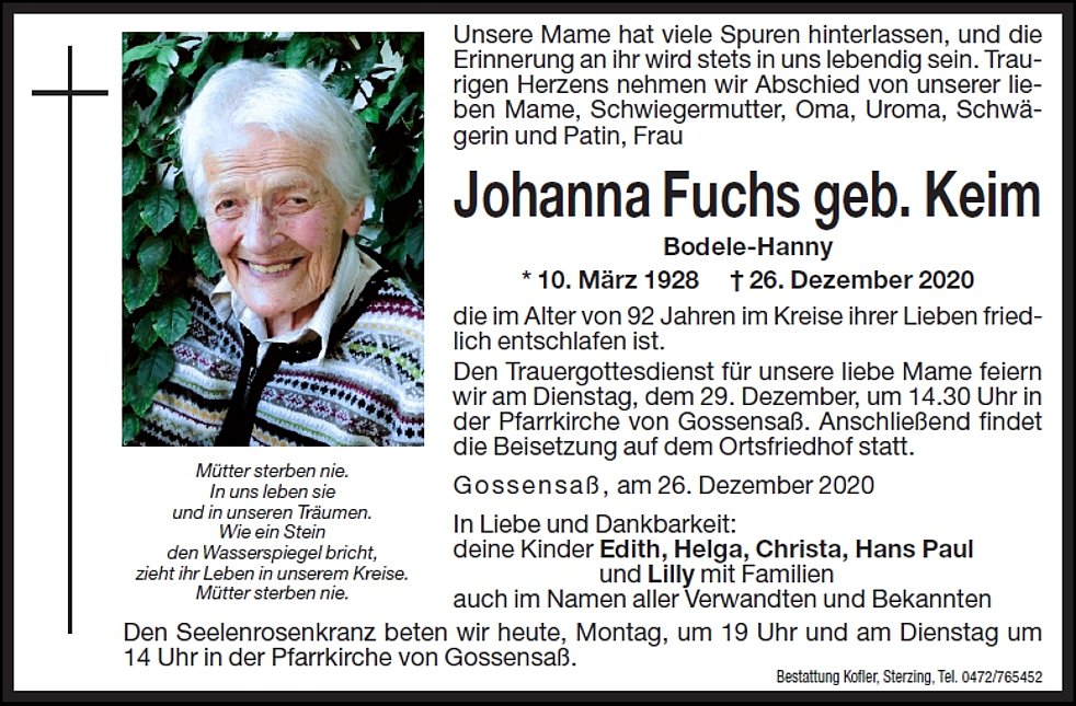 Den Trauergottesdienst für unsere liebe Mame feiern wir am Dienstag, dem 29. Dezember, um 14.30 Uhr in der Pfarrkirche von Gossensaß. Anschließend findet die Beisetzung auf dem Ortsfriedhof statt.