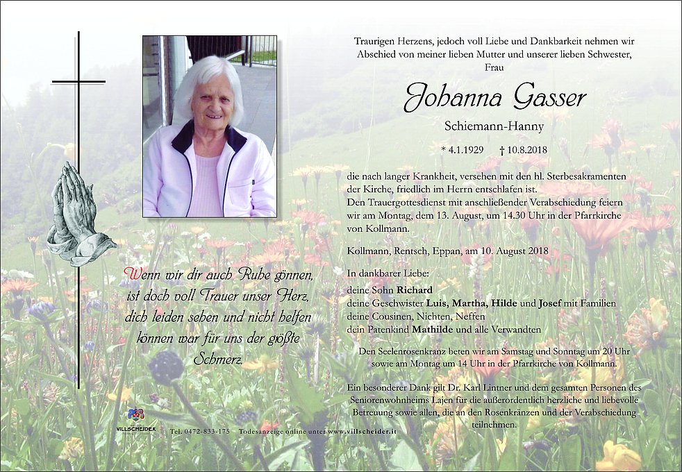Ein besonderer Dank gilt Dr. Karl Lintner und dem gesamten Personen des Seniorenwohnheims Lajen für die außerordentlich herzliche und liebevolle Betreuung sowie allen, die an den Rosenkränzen und der Verabschiedung teilnehmen.