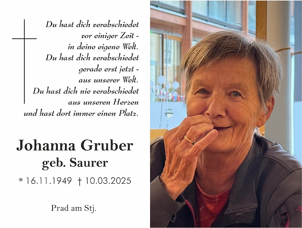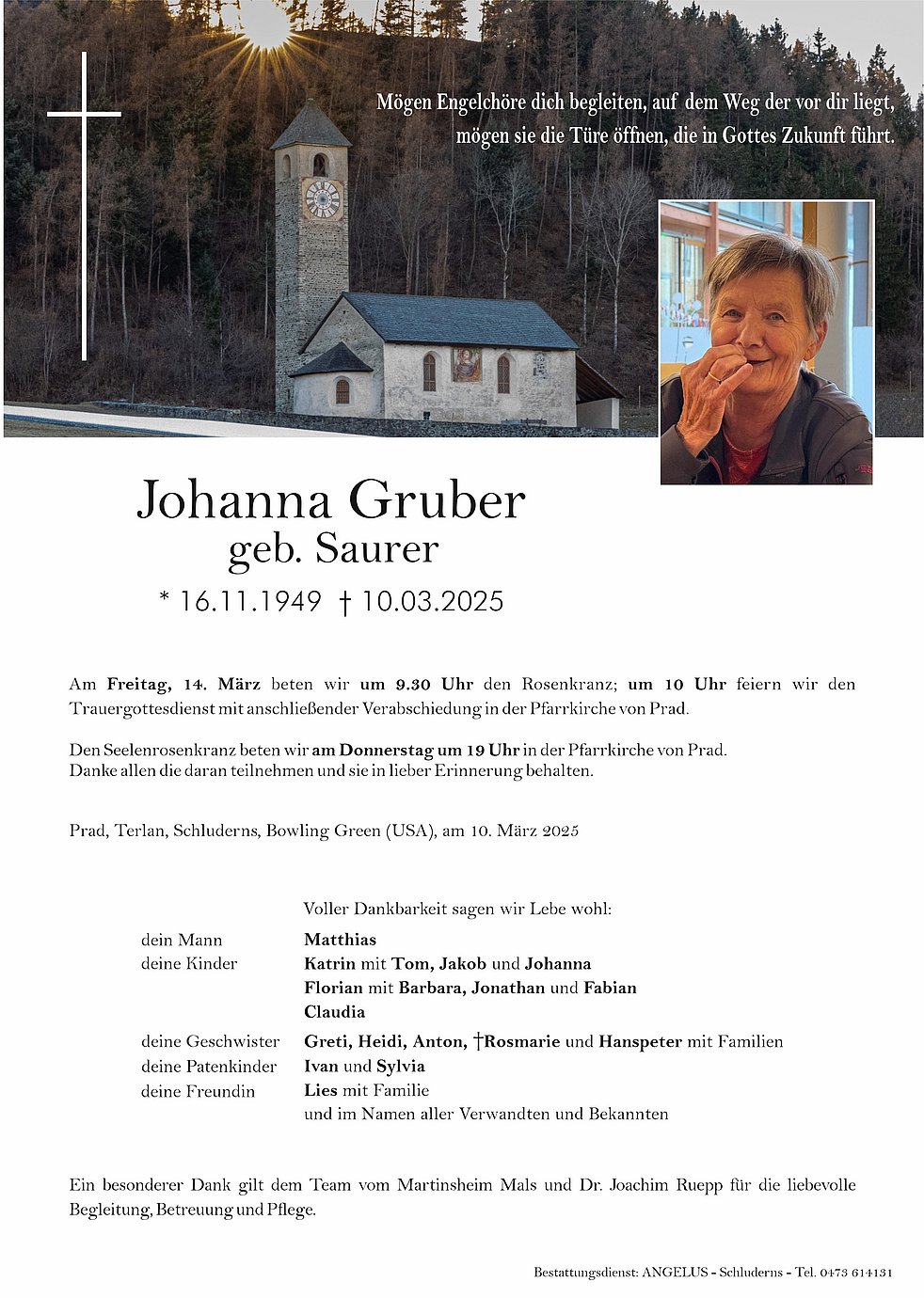 Am Freitag, 14. März beten wir um 9.30 Uhr den Rosenkranz; um 10 Uhr feiern wir den Trauergottesdienst mit anschließender Verabschiedung in der Pfarrkirche von Prad.