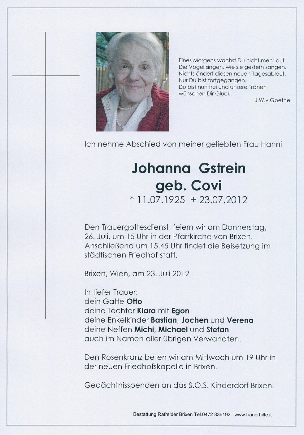 Gedankt sei der Hausärztin Frau Dr. Monika Baumgartner für die liebevolle Betreuung und allen, die am Rosenkranz und an der Beerdigung teilnehmen.