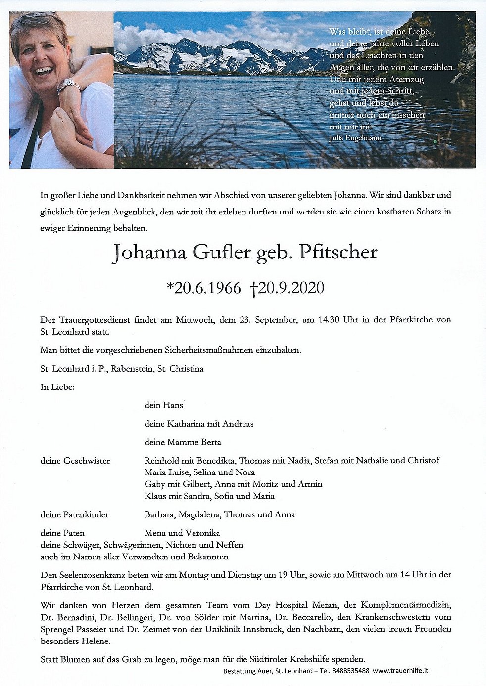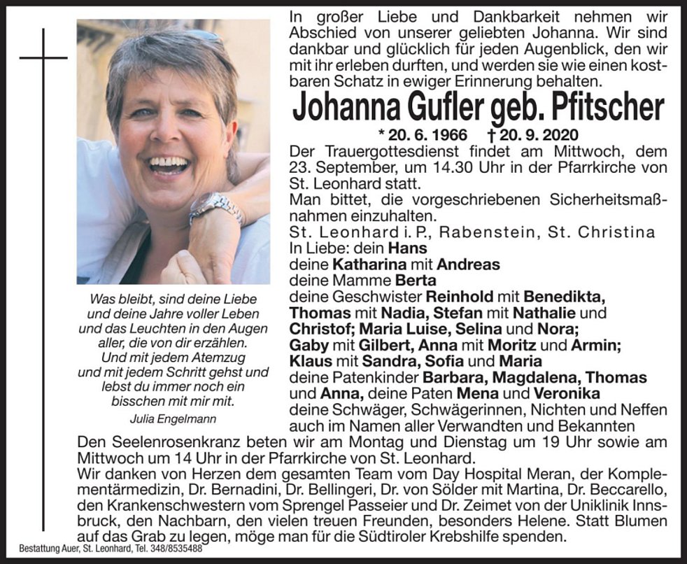 Statt Blumen auf das Grab zu legen, möge man für die Südtiroler Krebshilfe spenden.