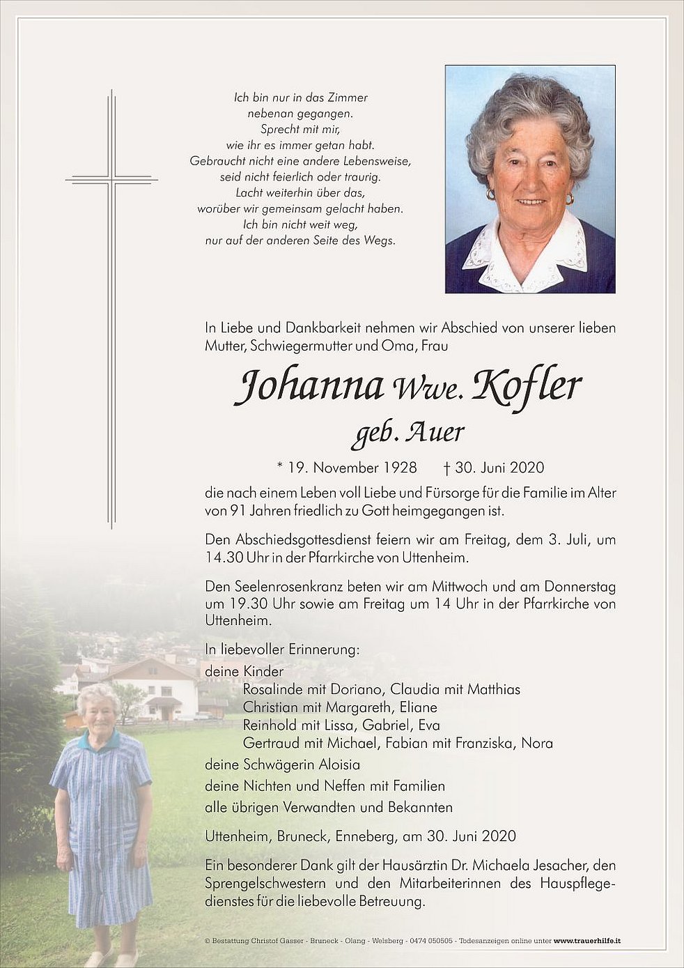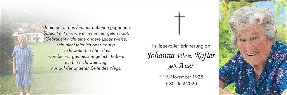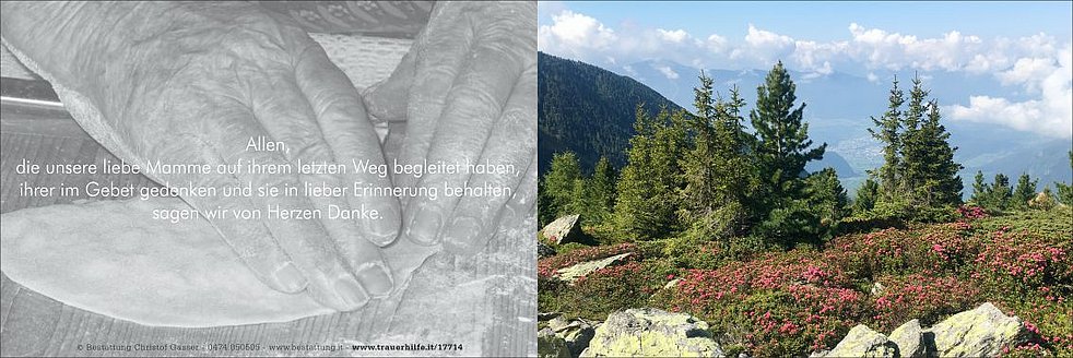 Ein besonderer Dank gilt der Hausärztin Dr. Michaela Jesacher, den Sprengelschwestern und den Mitarbeiterinnen des Hauspflegedienstes für die liebevolle Betreuung.