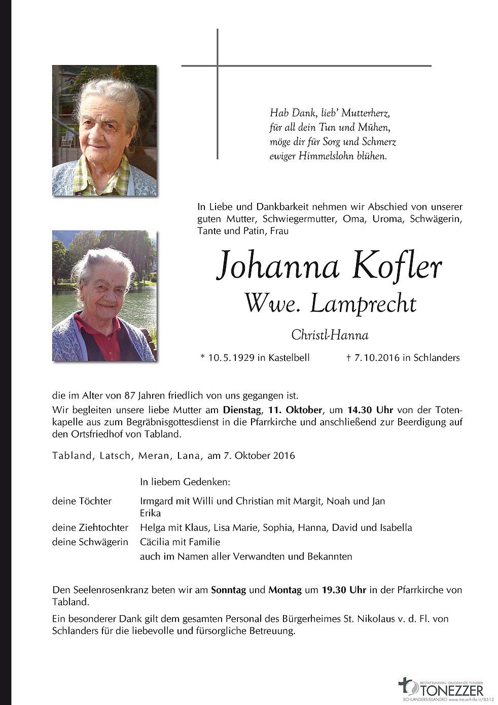 Wir begleiten unsere liebe Mutter am Dienstag, 11. Oktober, um 14.30 Uhr von der Totenkapelle aus zum Begräbnisgottesdienst in die Pfarrkirche und anschließend zur Beerdigung auf den Ortsfriedhof von Tabland.