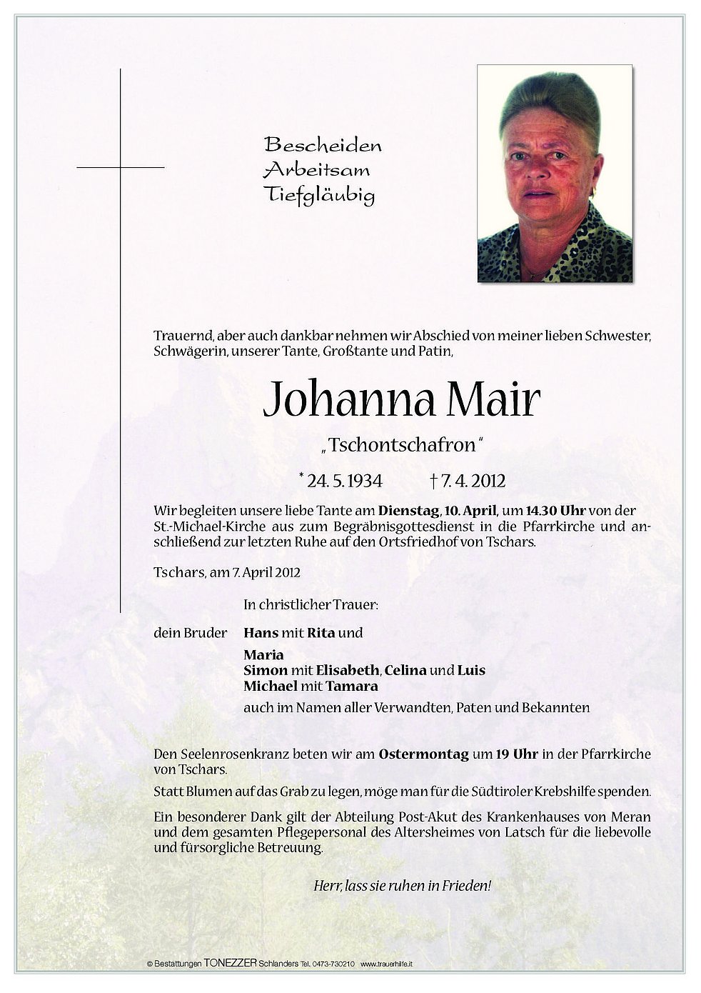 Wir begleiten unsere liebe Tante am Dienstag, 10. April, um 14.30 Uhr von der St.-Michael-Kirche aus zum Begräbnisgottesdienst in die Pfarrkirche und anschließend zur letzten Ruhe auf den Ortsfriedhof von Tschars.