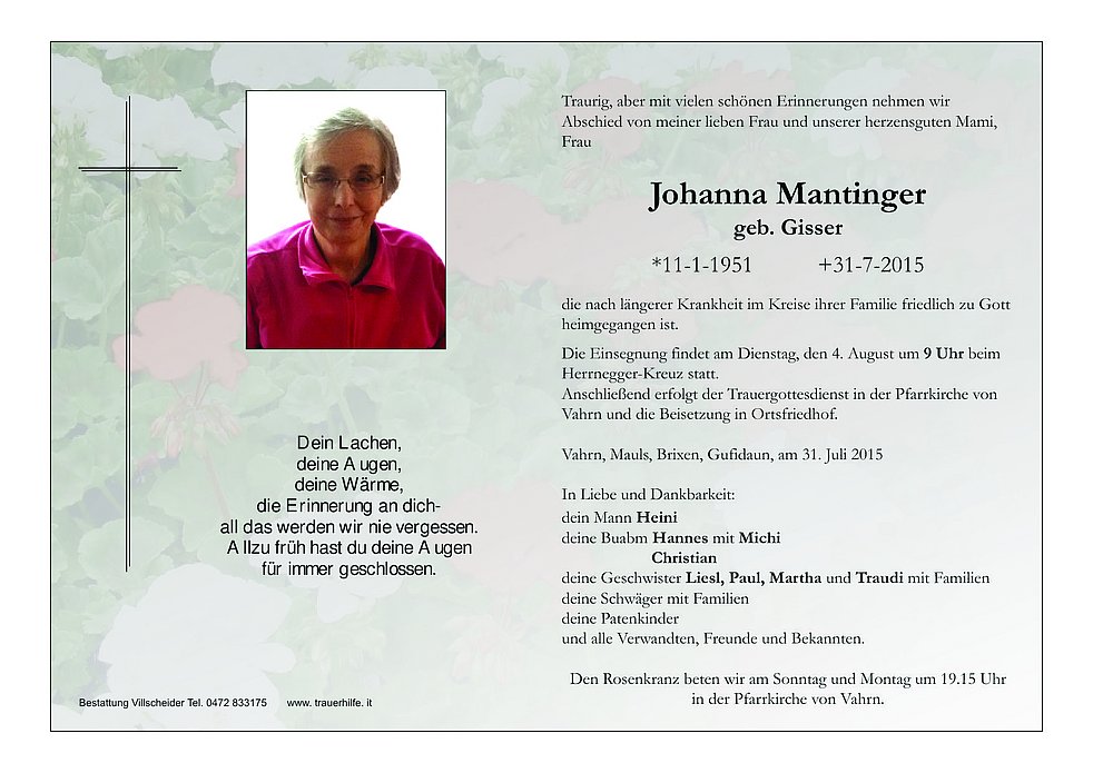 Anschließend erfolgt der Trauergottesdienst in der Pfarrkirche von Vahrn und die Beisetzung in Ortsfriedhof.