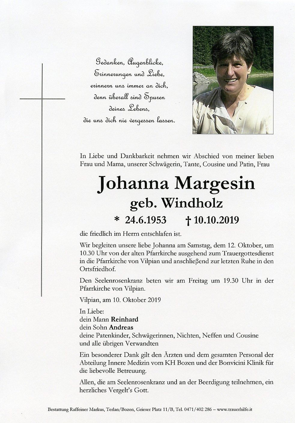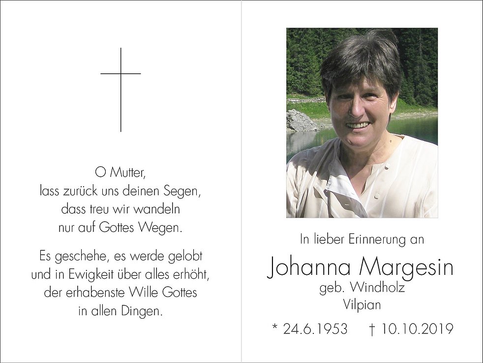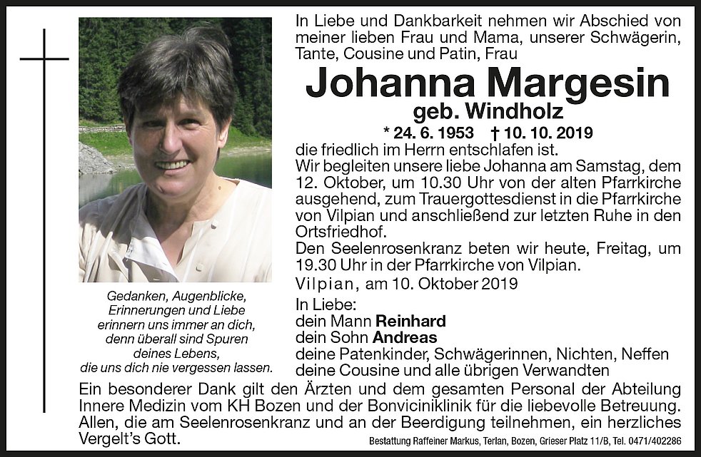 Wir begleiten unsere liebe Johanna am Samstag, dem 12. Oktober, um 10.30 Uhr von der alten Pfarrkirche ausgehend zum Trauergottesdienst in die Pfarrkirche von Vilpian und anschlieβend zur letzten Ruhe in den Ortsfriedhof.