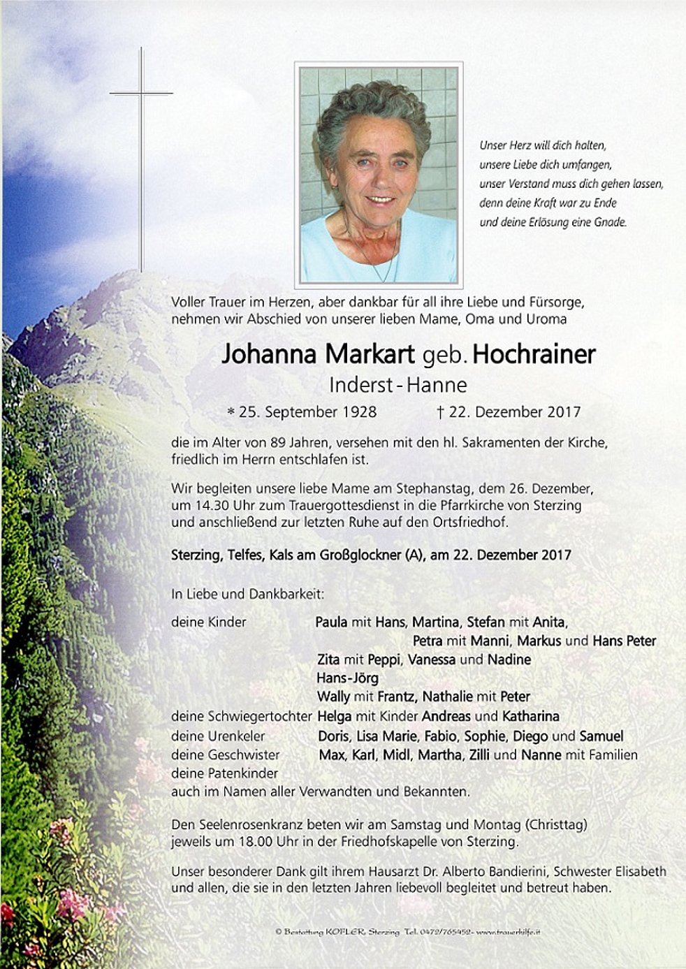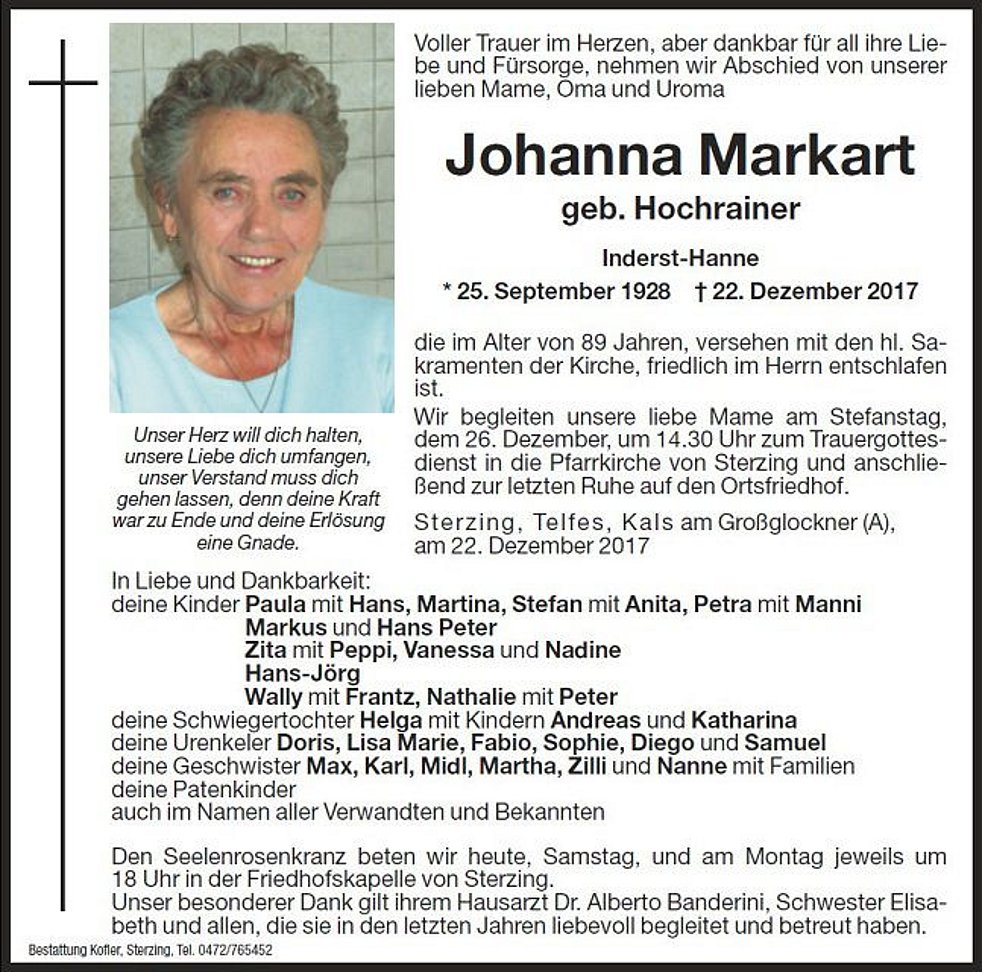 Wir begleiten unsere liebe Mame am Stephanstag, dem 26. Dezember, um 14.30 Uhr zum Trauergottesdienst in die Pfarrkirche von Sterzing und anschließend zur letzten Ruhe auf den Ortsfriedhof.