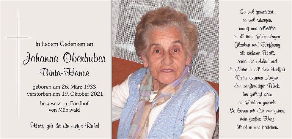 Den Abschiedsgottesdienst feiern wir am Freitag, dem 22. Oktober, um 14.30 Uhr in der Pfarrkirche von Mühlwald. Anschließend übergeben wir sie der geweihten Erde.