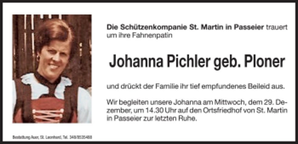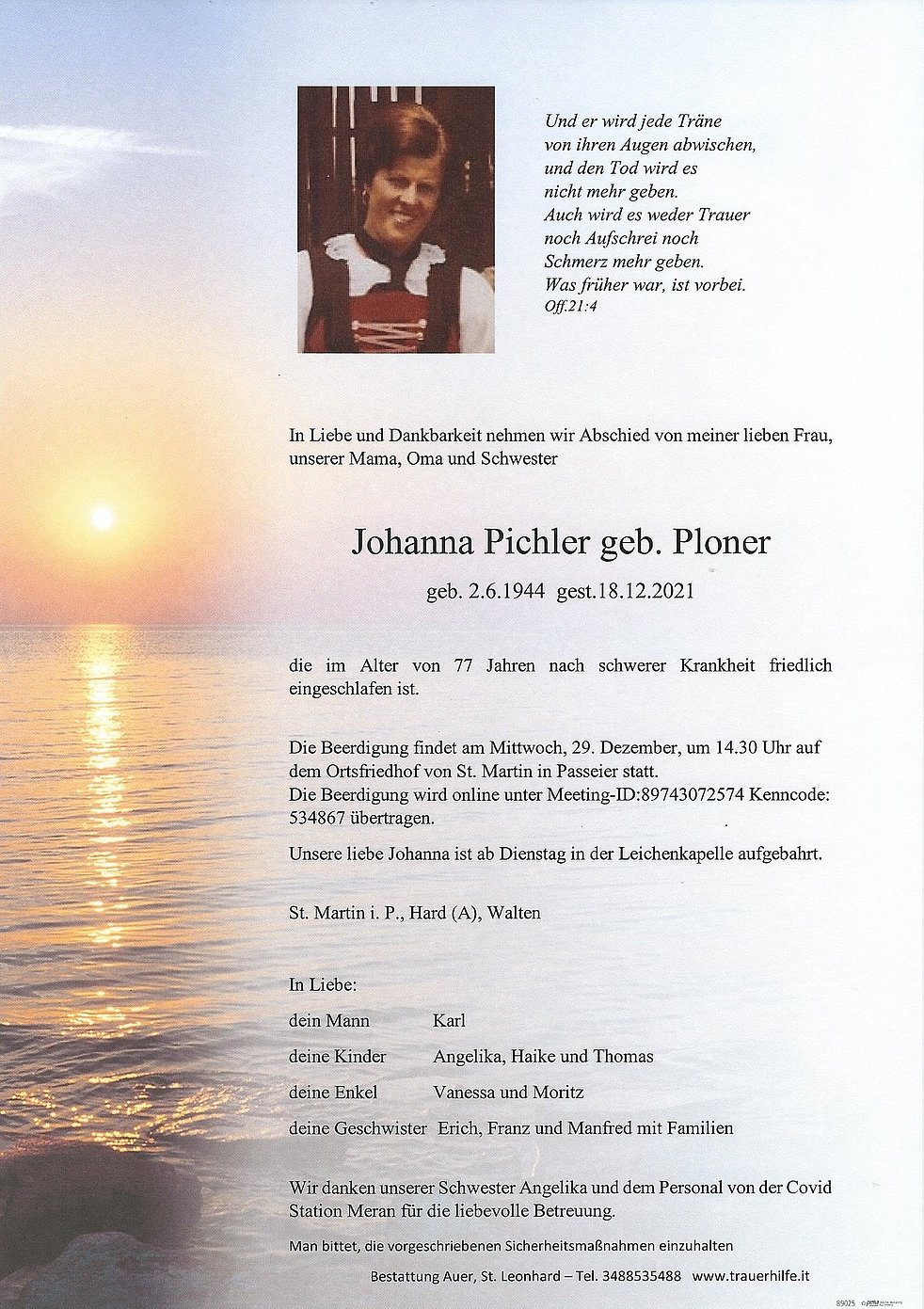 Die Beerdigung findet am Mittwoch, 29. Dezember, um 14.30 Uhr auf dem Ortsfriedhof von St. Martin in Passeier statt.
