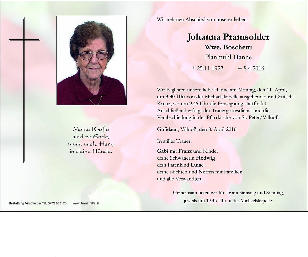 Wir begleiten unsere liebe Hanne am Montag, den 11. April,