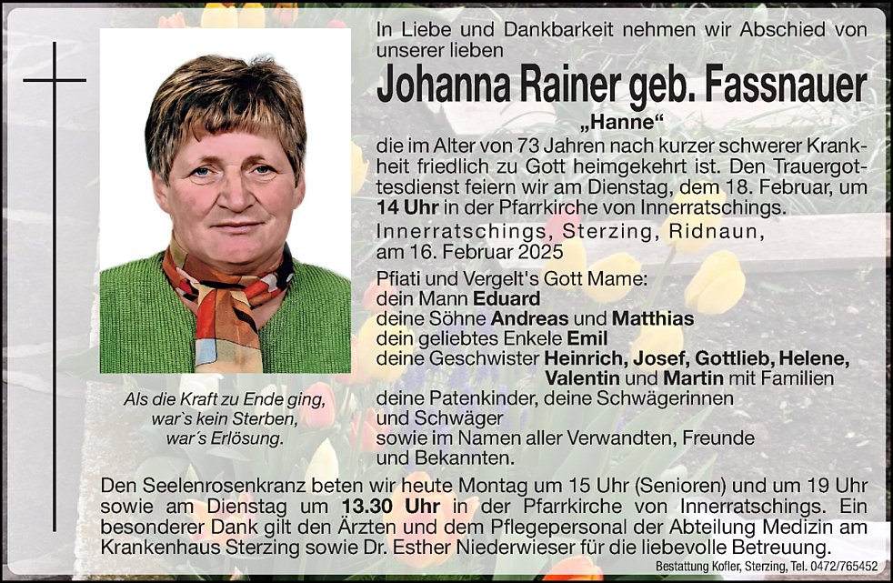 Den Trauergottesdienst feiern wir am Dienstag, dem 18. Februar, um 14.00 Uhr in der Pfarrkirche von Innerratschings. Die Urnenbeisetzung findet zu einem späteren Zeitpunkt im engsten Familienkreis statt.