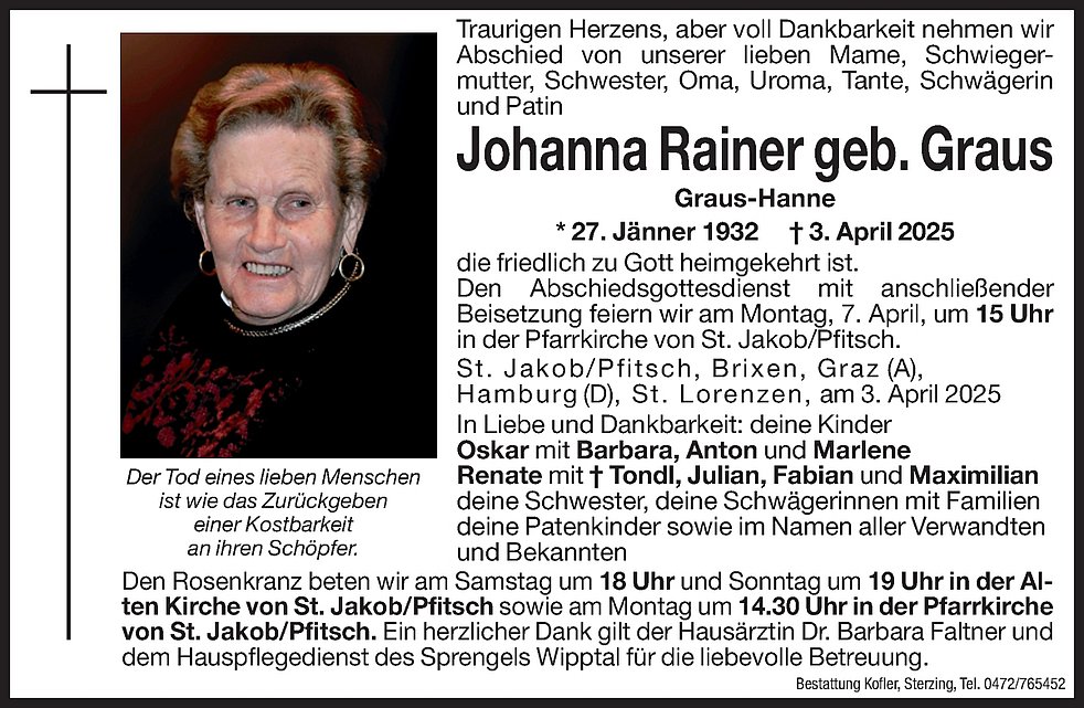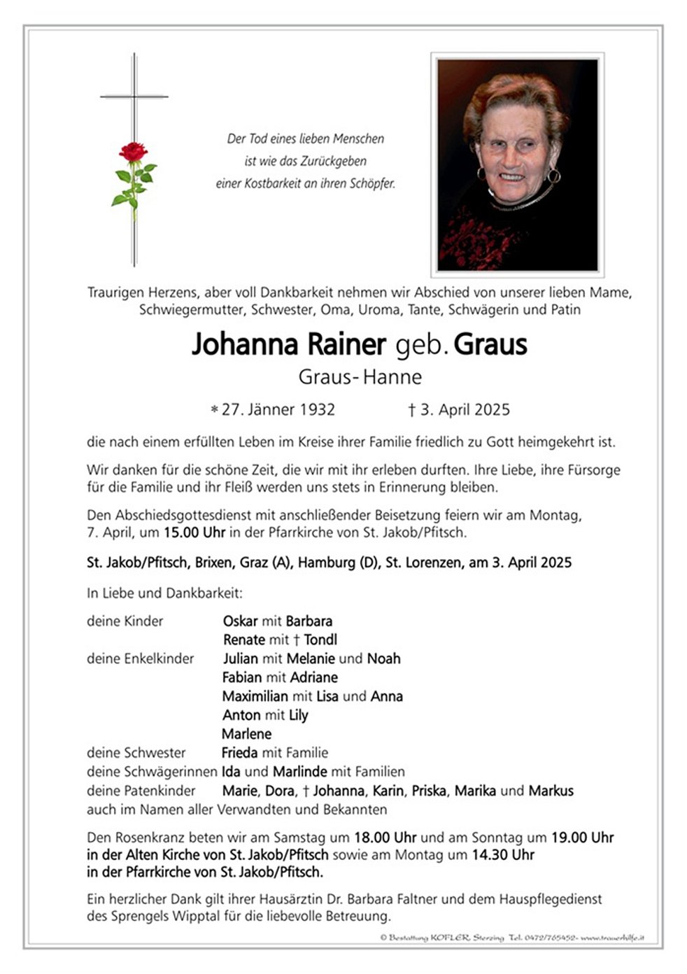 Den Abschiedsgottesdienst mit anschließender Beisetzung feiern wir am Montag, 7. April, um 15.00 Uhr in der Pfarrkirche von St. Jakob/Pfitsch.