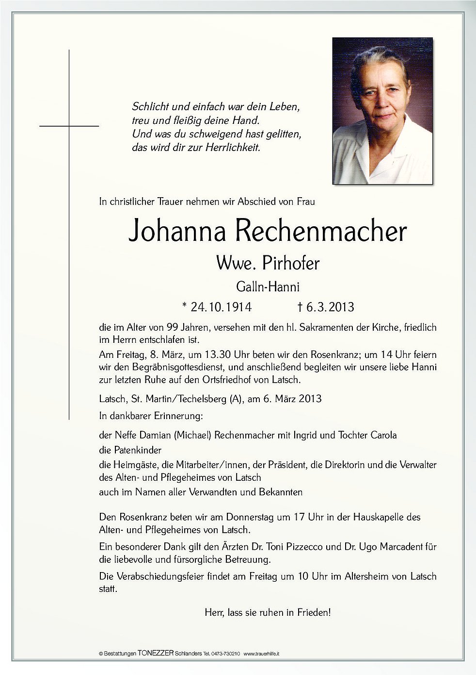 Am Freitag, 8. März, um 13.30 Uhr beten wir den Rosenkranz; um 14 Uhr feiern wir den Begräbnisgottesdienst, und anschließend begleiten wir unsere liebe Hanni zur letzten Ruhe auf den Ortsfriedhof von Latsch.