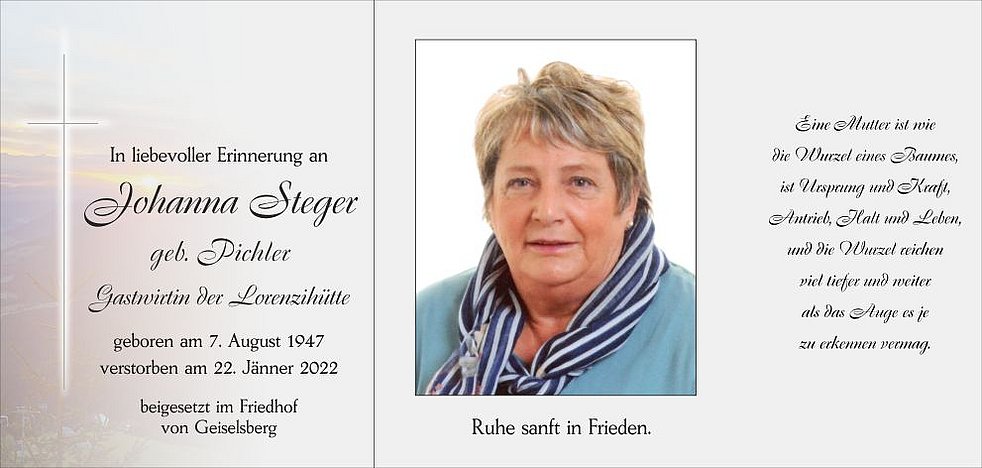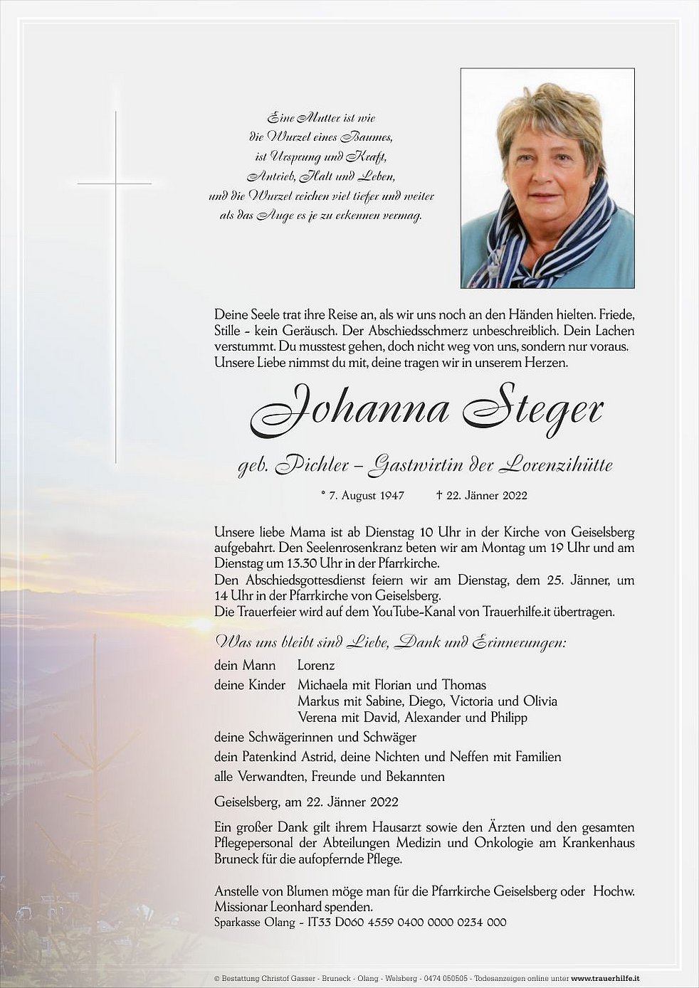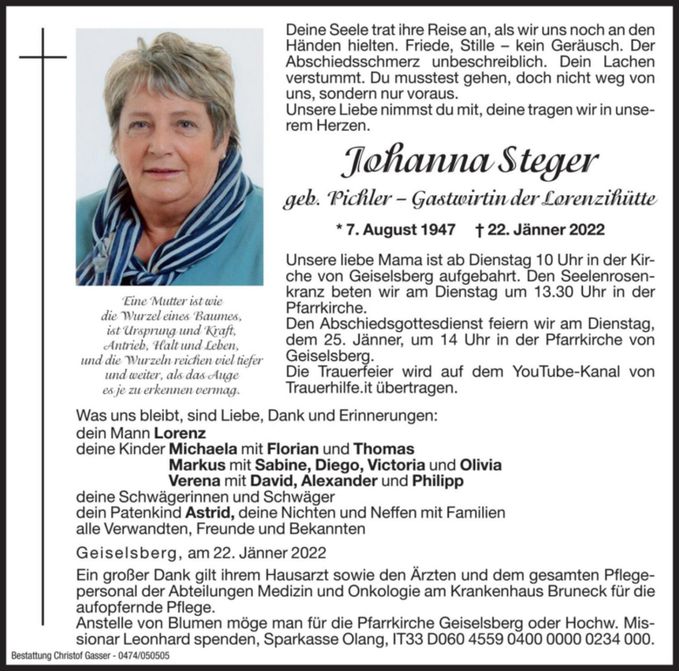Unsere liebe Mama ist ab Dienstag 10 Uhr in der Kirche von Geiselsberg aufgebahrt. Den Seelenrosenkranz beten wir am Montag um 19 Uhr und am Dienstag um 13.30 Uhr in der Pfarrkirche.