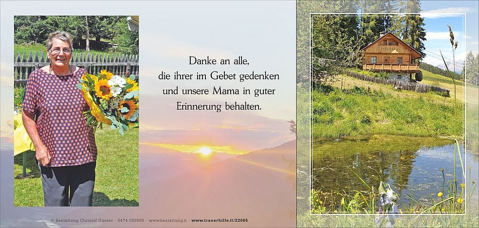 Ein großer Dank gilt ihrem Hausarzt sowie den Ärzten und den gesamten Pflegepersonal der Abteilungen Medizin und Onkologie am Krankenhaus Bruneck für die aufopfernde Pflege.