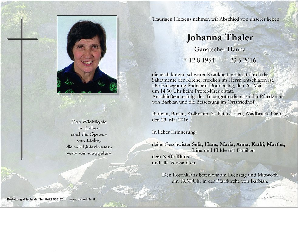 Anschließend erfolgt der Trauergottesdienst in der Pfarrkirche von Barbian und die Beisetzung im Ortsfriedhof.
