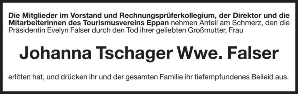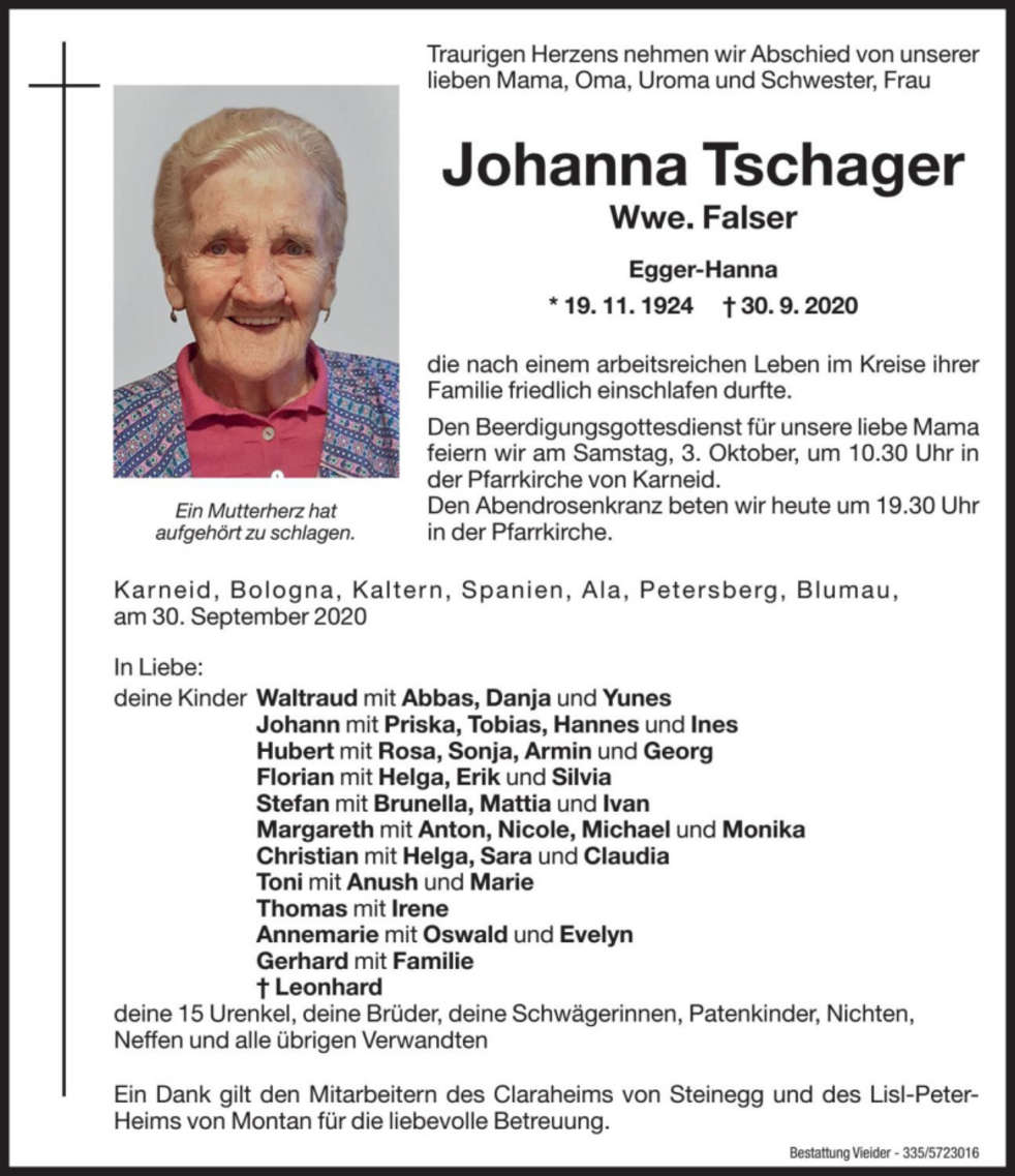 Den Beerdigungsgottesdienst für unsere liebe Mama feiern wir am Samstag, 3. Oktober, um 10.30 Uhr in der Pfarrkirche von Karneid.