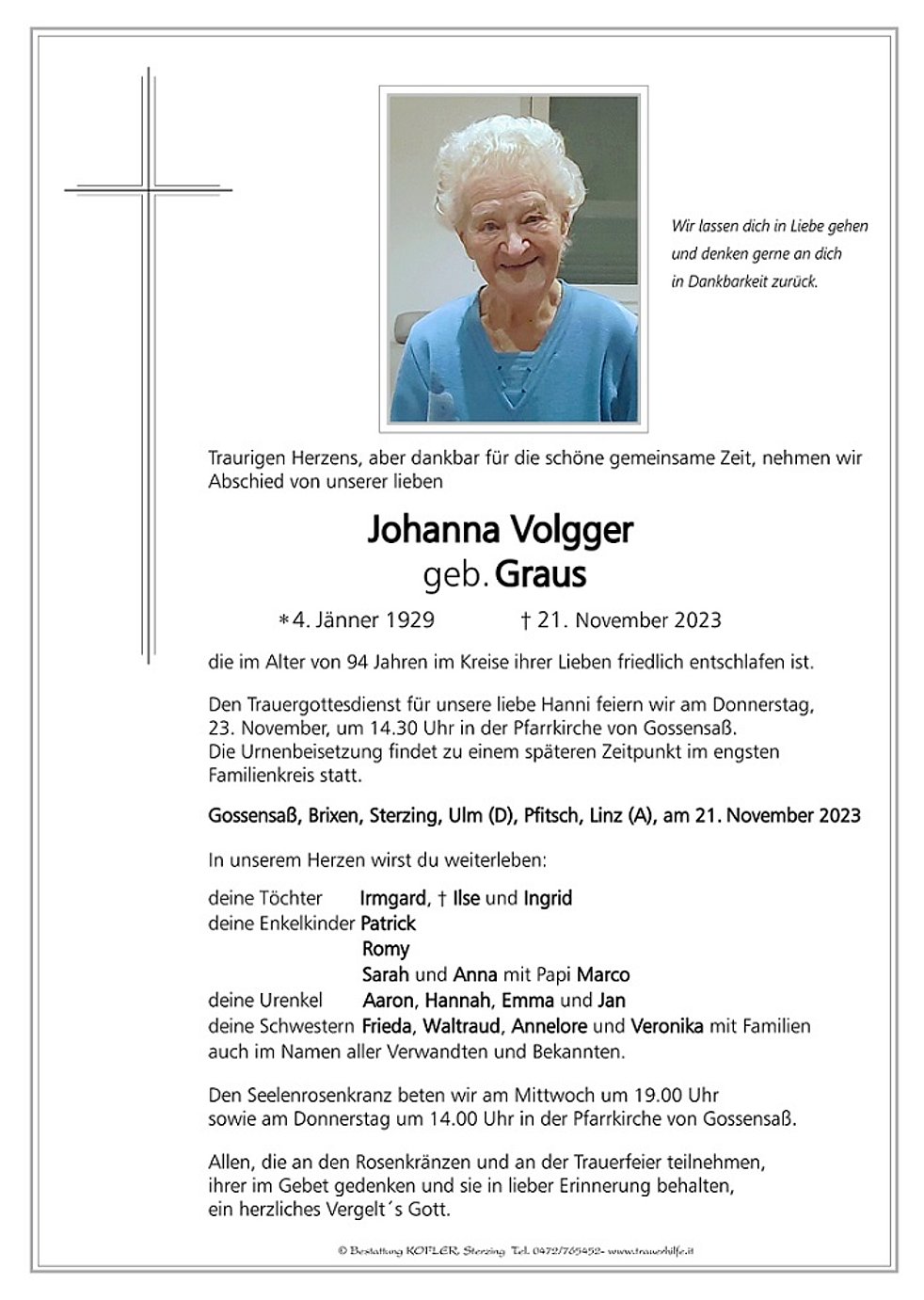 Den Trauergottesdienst für unsere liebe Hanni feiern wir am Donnerstag, 23. November, um 14.30 Uhr in der Pfarrkirche von Gossensaß. Die Urnenbeisetzung findet zu einem späteren Zeitpunkt im engsten Familienkreis statt.