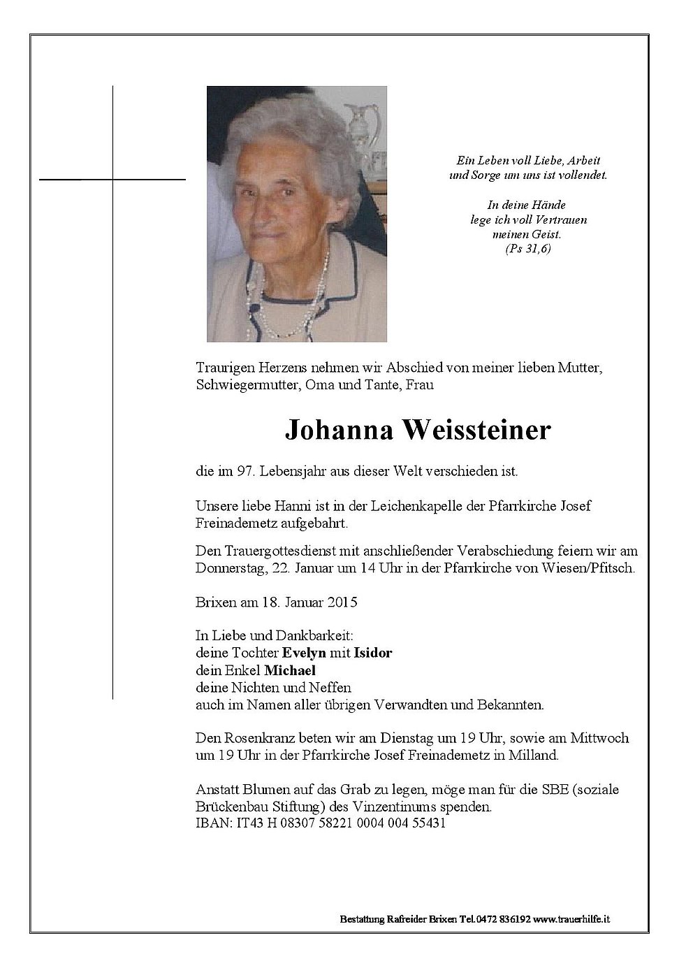 Den Trauergottesdienst mit anschließender Verabschiedung feiern wir am Donnerstag, 22. Januar um 14 Uhr in der Pfarrkirche von Wiesen/Pfitsch.