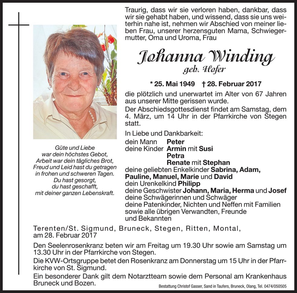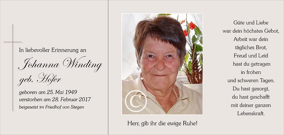 Der Abschiedsgottesdienst findet am Samstag, dem 4. März, um 14 Uhr in der Pfarrkirche von Stegen statt. Anschließend begleiten wir unsere liebe Mama zur letzten Ruhe in den Friedhof.