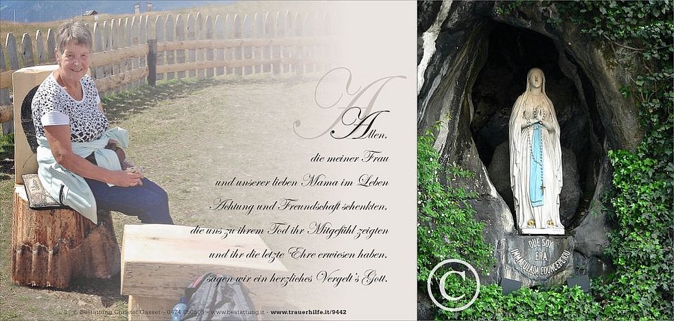 Allen, die an den Seelenrosenkränzen und an der Beerdigung von meiner Frau und unserer lieben Mama teilnehmen, ein herzliches Vergelt‘s Gott.