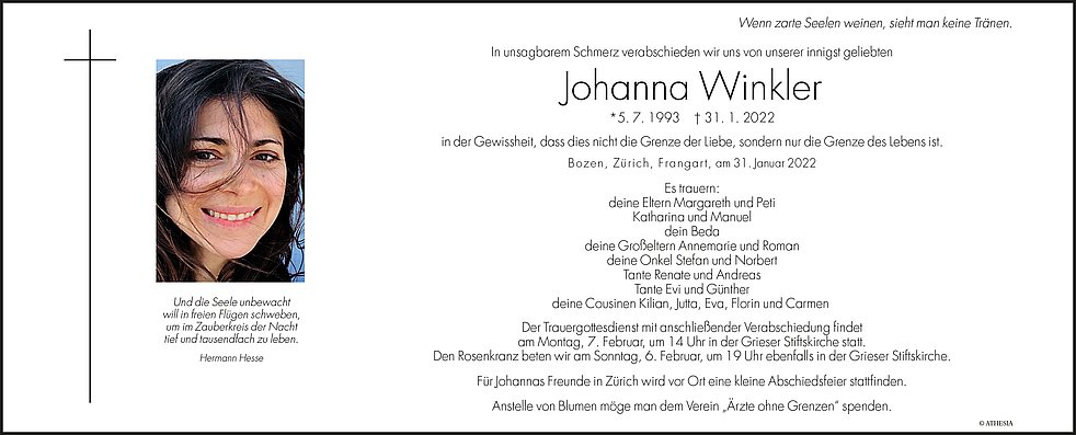 Anstelle von Blumen möge man dem Verein „Ärzte ohne Grenzen“ spenden.