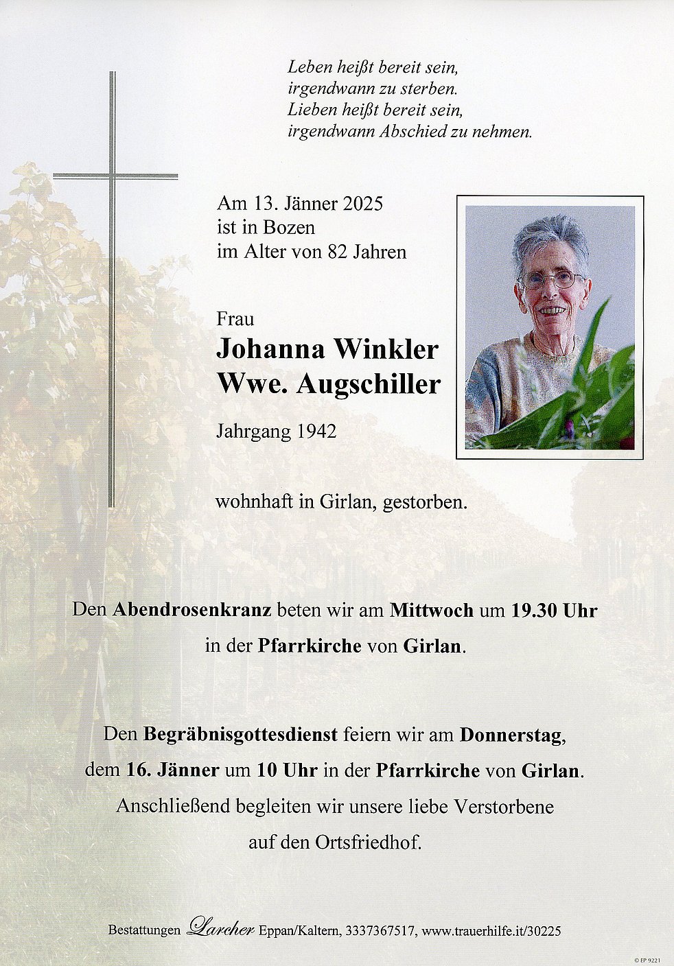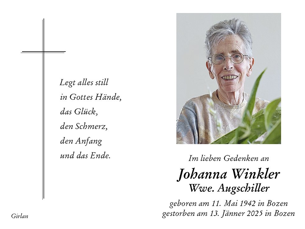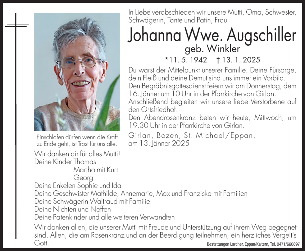 Den Begräbnisgottesdienst feiern wir am Donnerstag, dem 16. Jänner um 10 Uhr in der Pfarrkirche von Girlan. Anschließend begleiten wir unsere liebe Verstorbene auf den Ortsfriedhof.