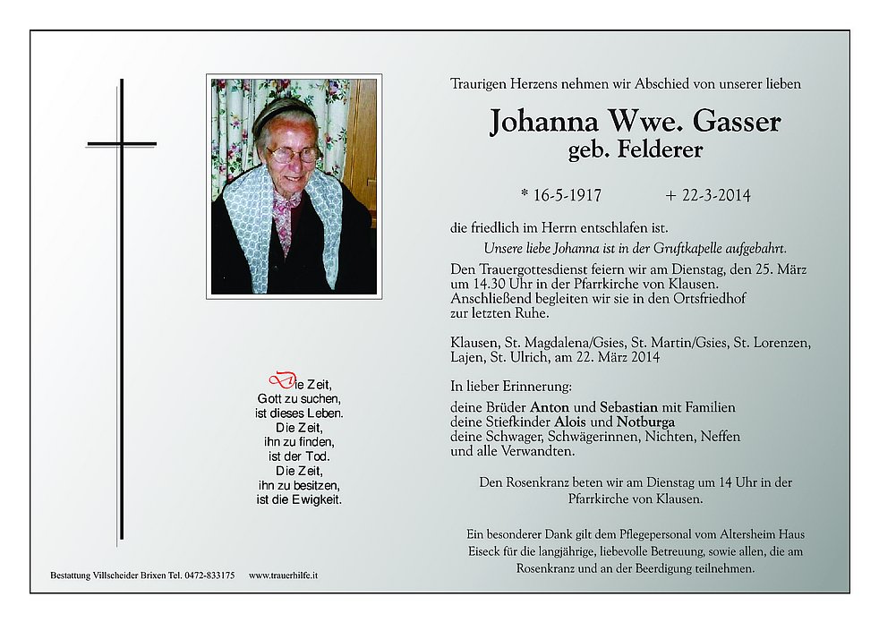 Ein besonderer Dank gilt dem Pflegepersonal vom Altersheim Haus Eiseck für die langjährige, liebevolle Betreuung, sowie allen, die am Rosenkranz und an der Beerdigung teilnehmen.