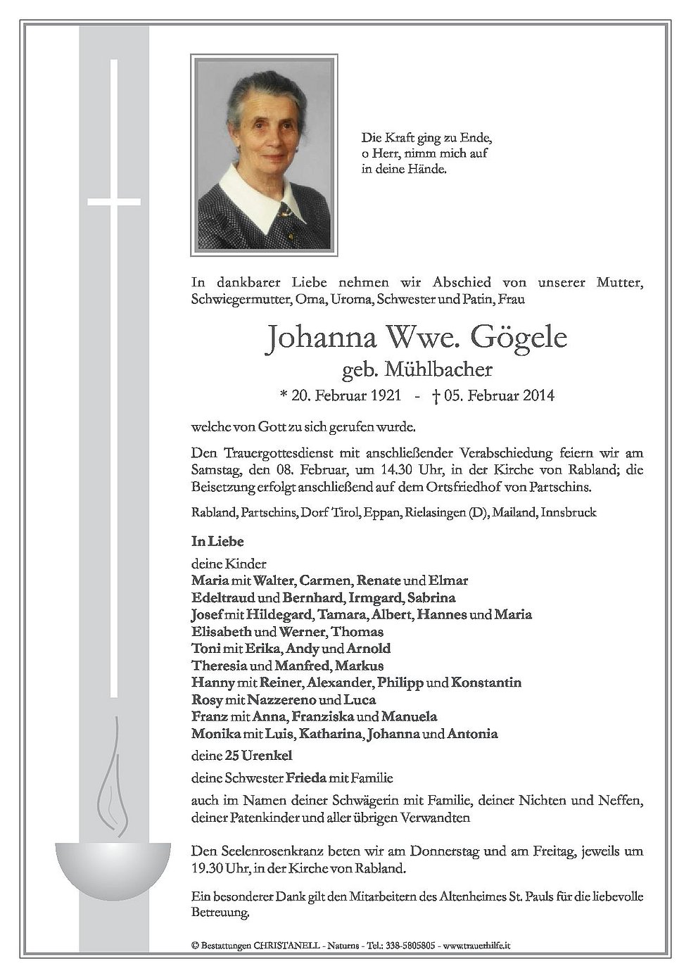 Den Trauergottesdienst mit anschließender Verabschiedung feiern wir am Samstag, den 08. Februar, um 14.30 Uhr, in der Kirche von Rabland; die Beisetzung erfolgt anschließend auf dem Ortsfriedhof von Partschins.