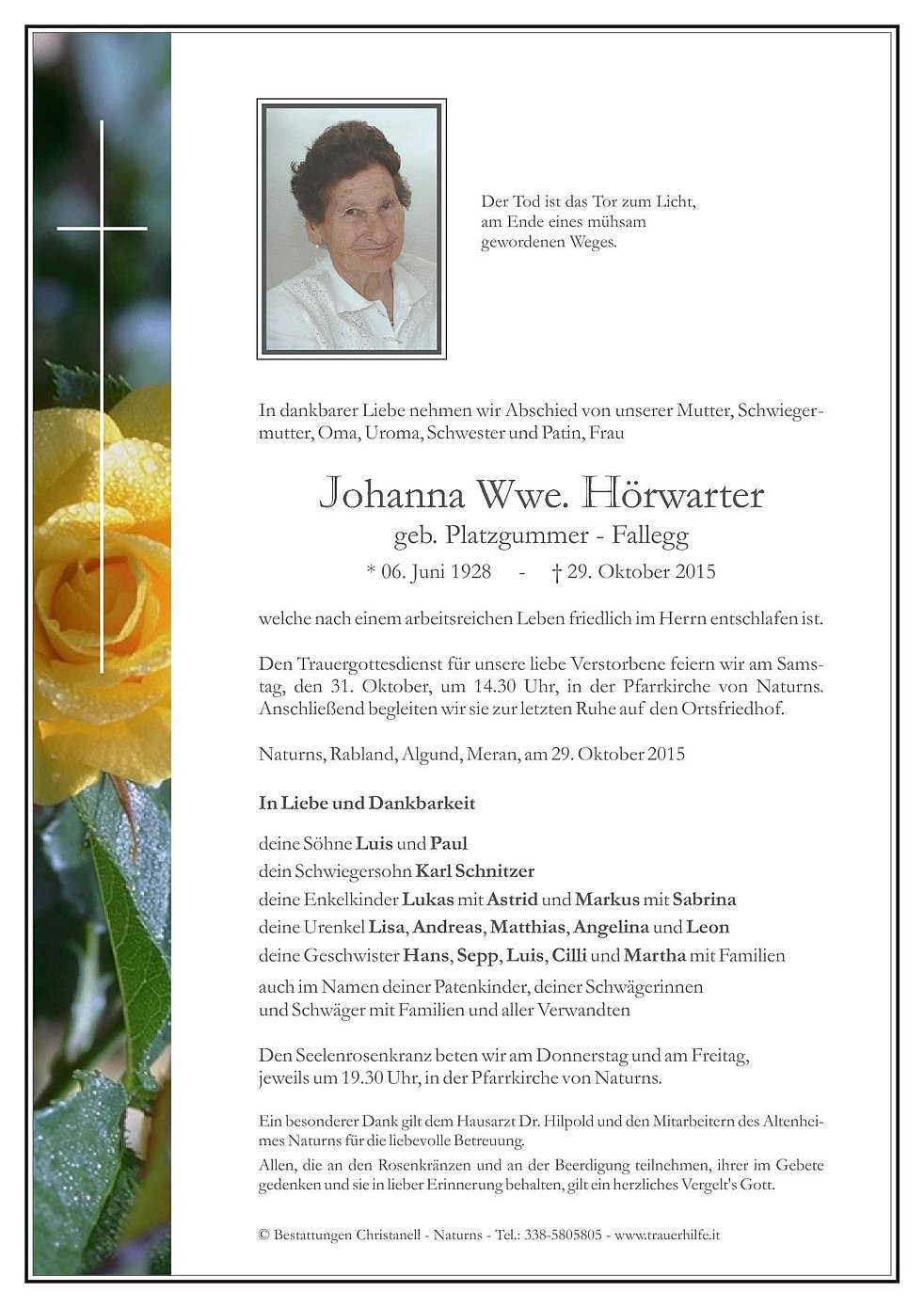Den Trauergottesdienst für unsere liebe Verstorbene feiern wir am Samstag, den 31. Oktober, um 14.30 Uhr, in der Pfarrkirche von Naturns. Anschließend begleiten wir sie zur letzten Ruhe auf den Ortsfriedhof.