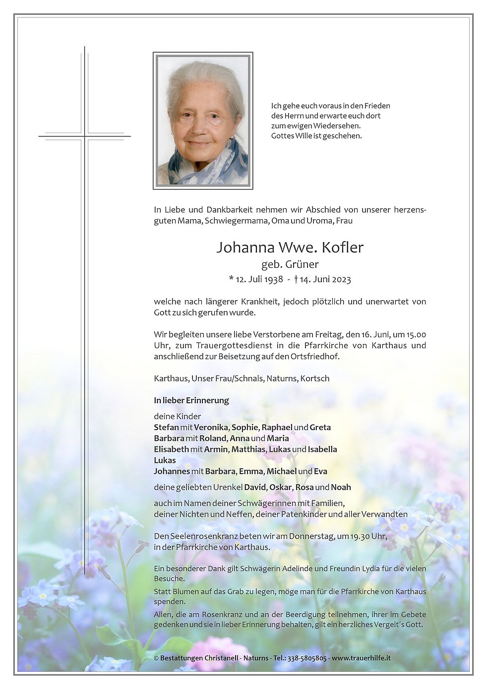 Wir begleiten unsere liebe Verstorbene am Freitag, den 16. Juni, um 15.00 Uhr, zum Trauergottesdienst in die Pfarrkirche von Karthaus und anschließend zur Beisetzung auf den Ortsfriedhof.