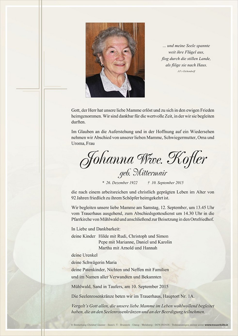 Wir begleiten unsere liebe Mamme am Samstag, 12. September, um 13.45 Uhr vom Trauerhaus ausgehend, zum Abschiedsgottesdienst um 14.30 Uhr in die Pfarrkirche von Mühlwald und anschließend zur Beisetzung in den Ortsfriedhof.
