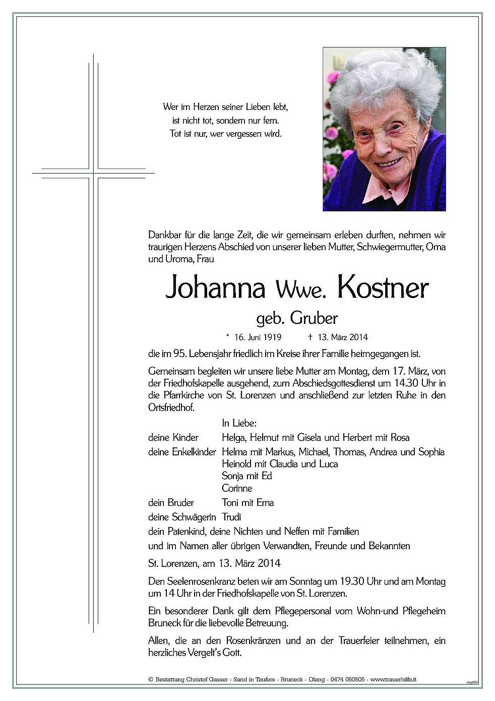 Gemeinsam begleiten wir unsere liebe Mutter am Montag, dem 17. März, von der Friedhofskapelle ausgehend, zum Abschiedsgottesdienst um 14.30 Uhr in die Pfarrkirche von St. Lorenzen und anschließend zur letzten Ruhe in den Ortsfriedhof.