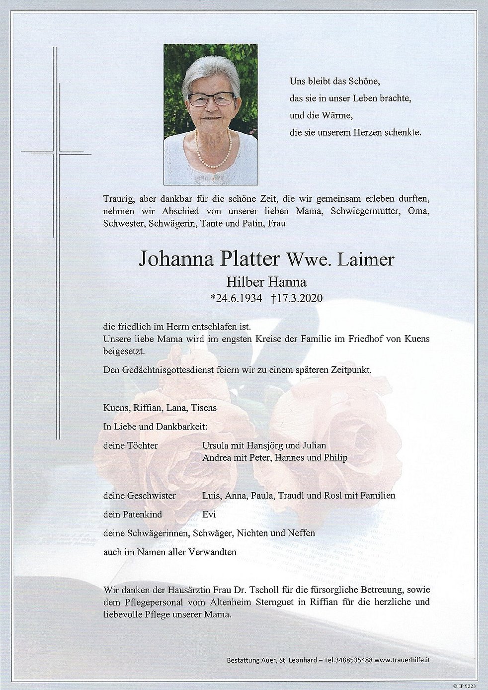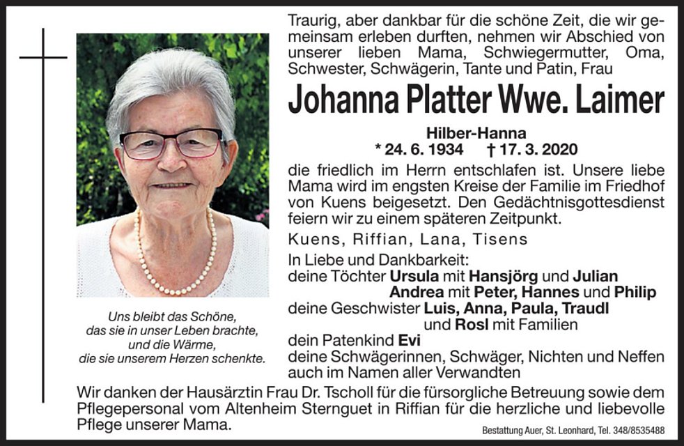Unsere liebe Mama wird im engsten Kreise der Familie im Friedhof von Kuens beigesetzt.