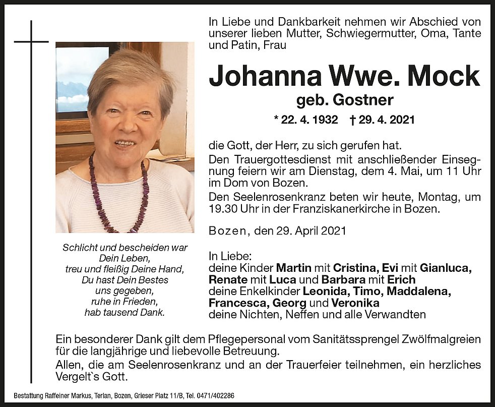 Den Trauergottesdienst mit anschlieβender Einsegnung feiern wir am Dienstag, dem 4. Mai, um 11 Uhr im Dom von Bozen.
