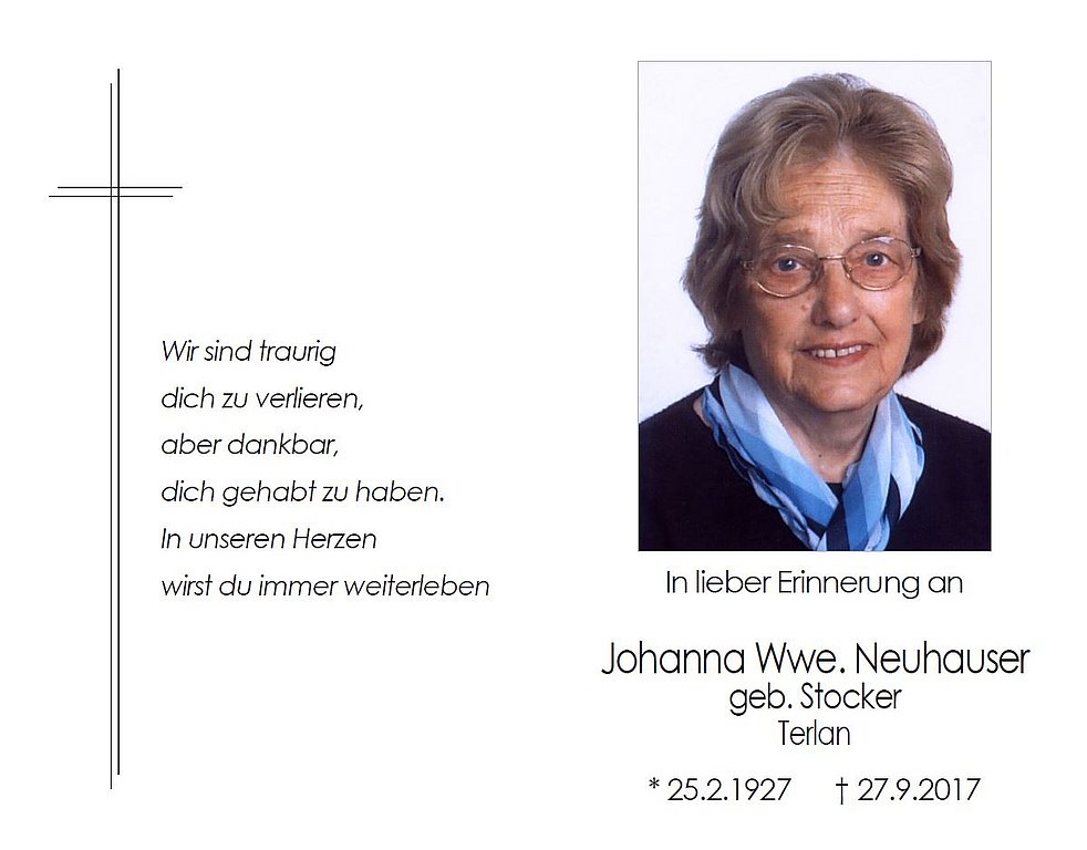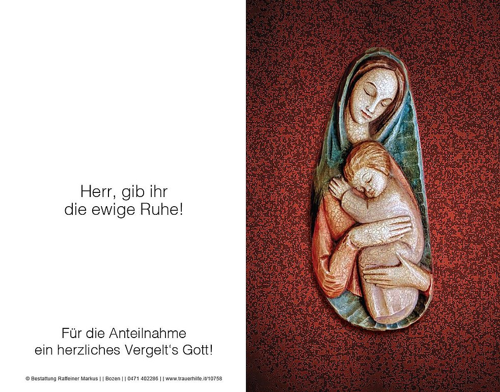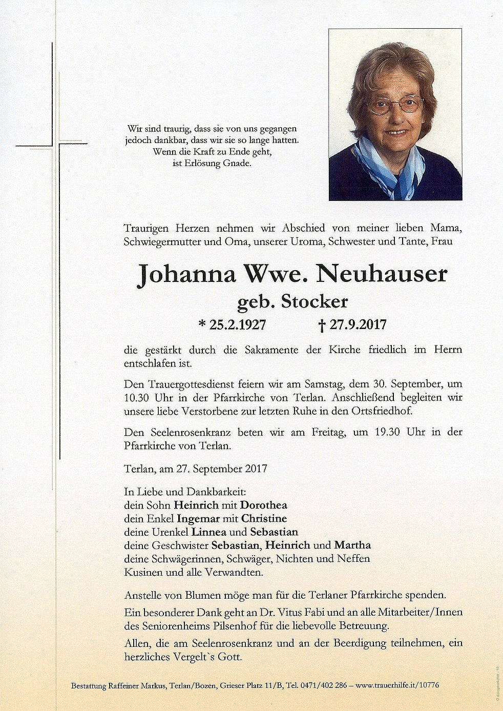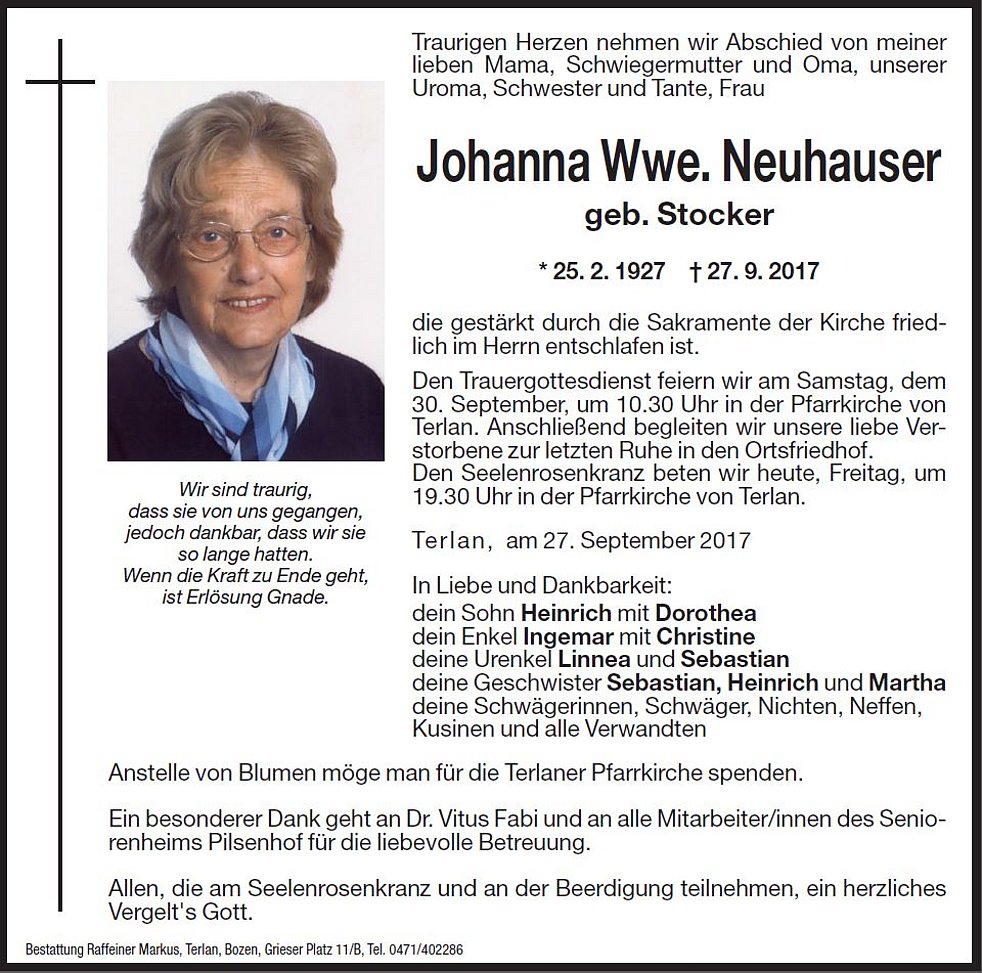Den Trauergottesdienst feiern wir am Samstag, dem 30. September, um 10.30 Uhr in der Pfarrkirche von Terlan. Anschließend begleiten wir unsere liebe Verstorbene zur letzten Ruhe in den Ortsfriedhof.