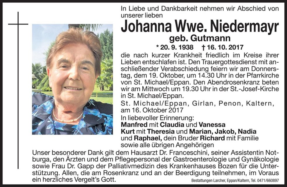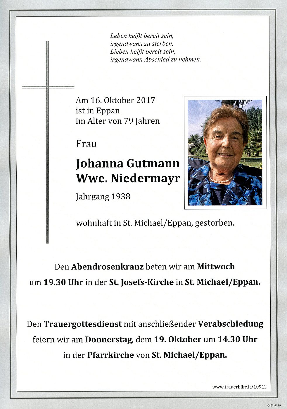 Den Trauergottesdienst mit anschließender Verabschiedung feiern wir am Donnerstag, dem 19. Oktober um 14.30 Uhr in der Pfarrkirche von St. Michael/Eppan.